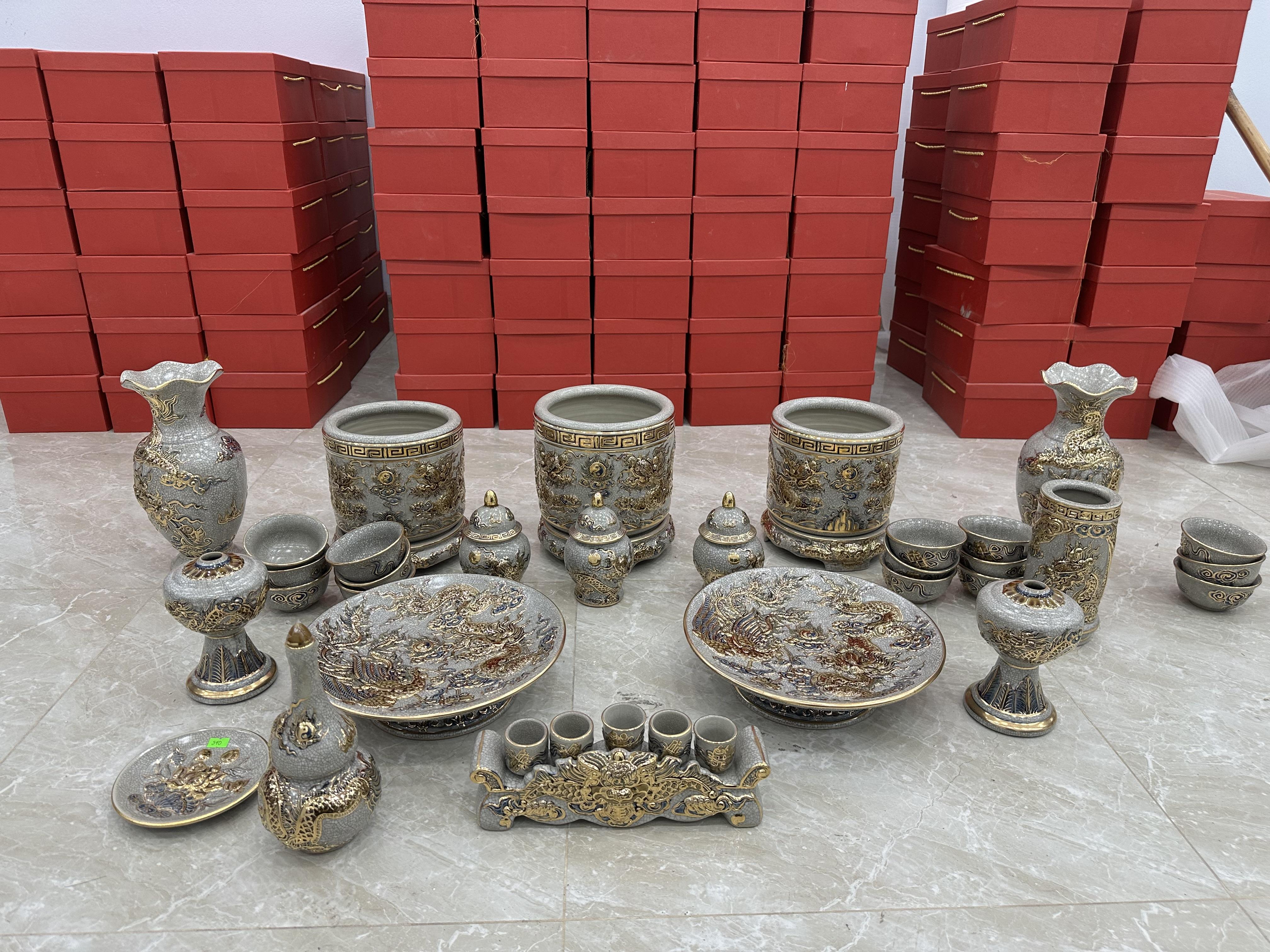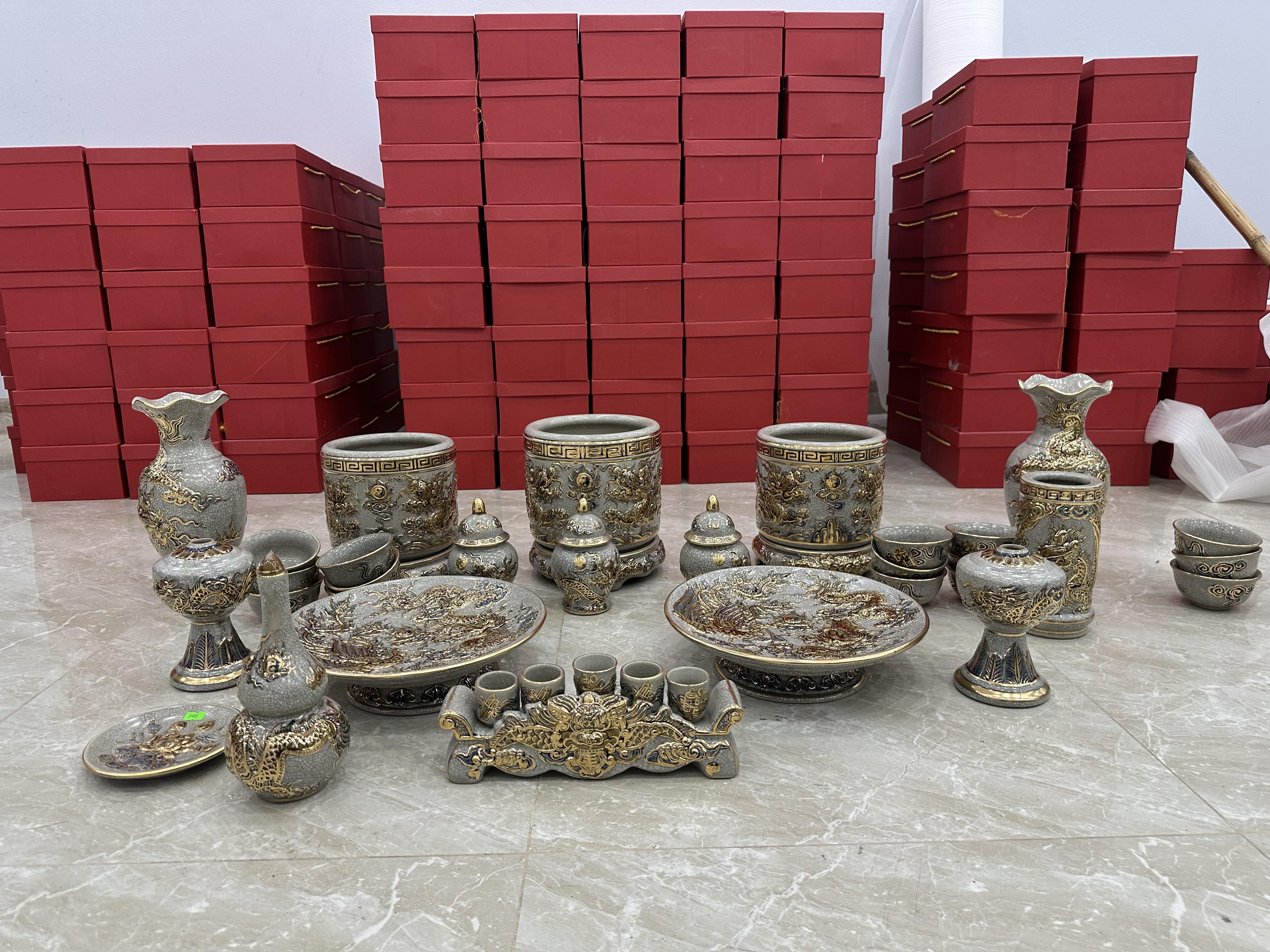 Dòng sản phẩm đồ thờ Men rạn đắp nổi vẽ vàng 24K là sự kết tinh hoàn hảo giữa tinh hoa làng nghề Bát Tràng truyền thống và vẻ đẹp sang trọng bậc nhất. Mỗi sản phẩm từ Gốm Hương Thủy không chỉ là vật phẩm thờ cúng, mà còn là một tác phẩm nghệ thuật phong thủy giúp gia chủ chiêu tài, dẫn lộc và thể hiện lòng thành kính với gia tiên.