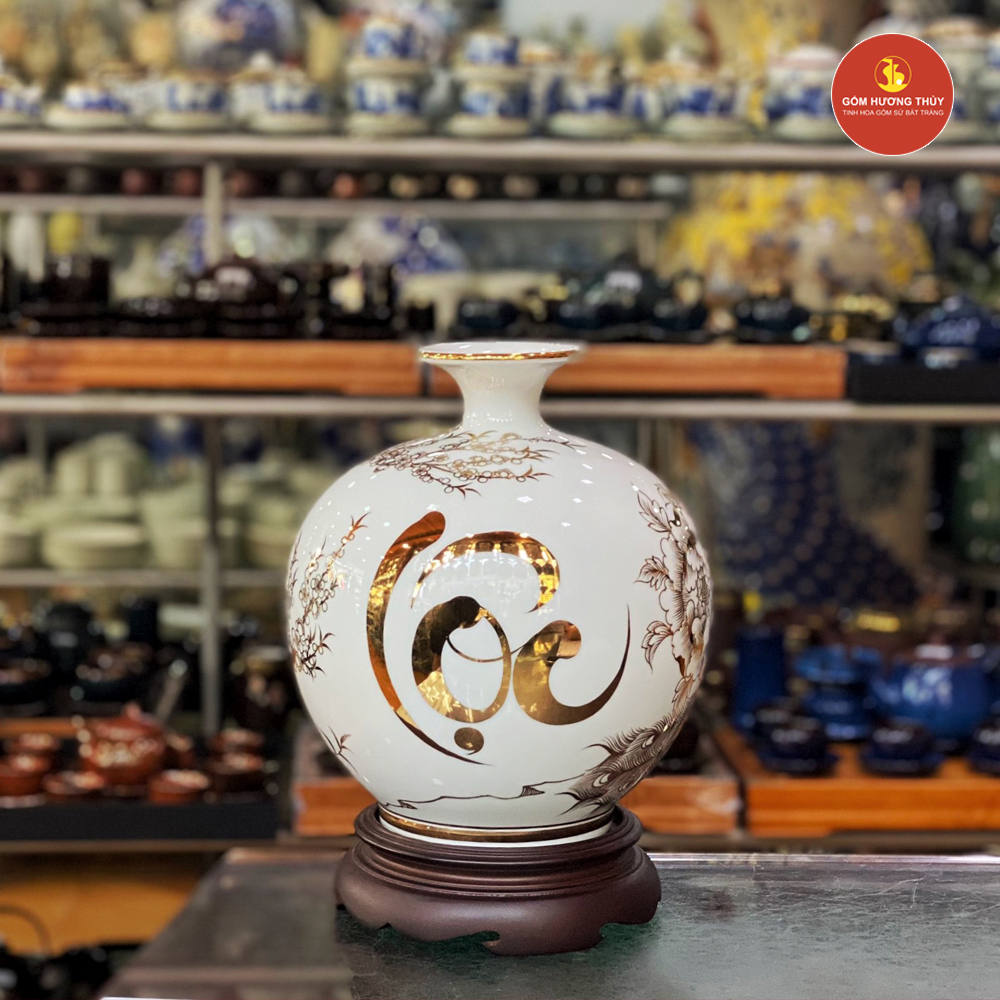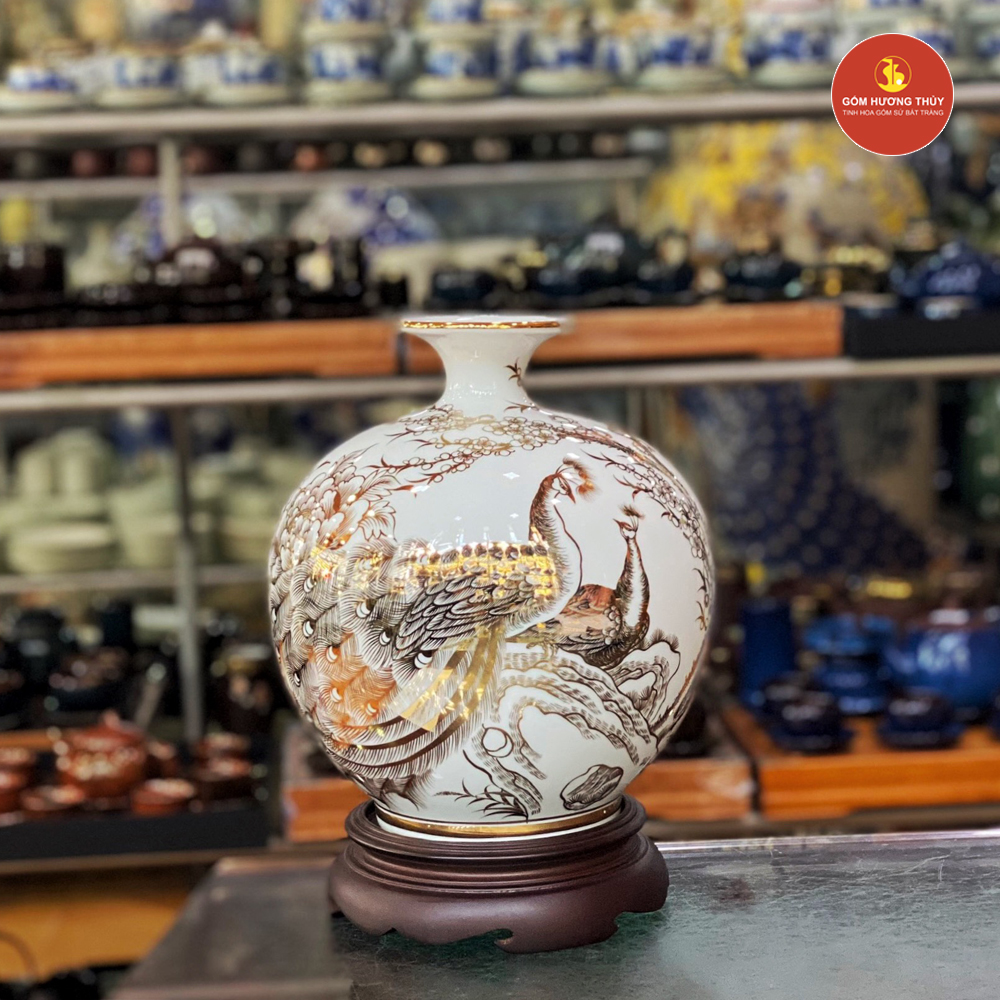 TÊN SẢN PHẨM: Bình Hút Lộc H25 Chim Công Nền Trắng Vẽ Vàng 24K