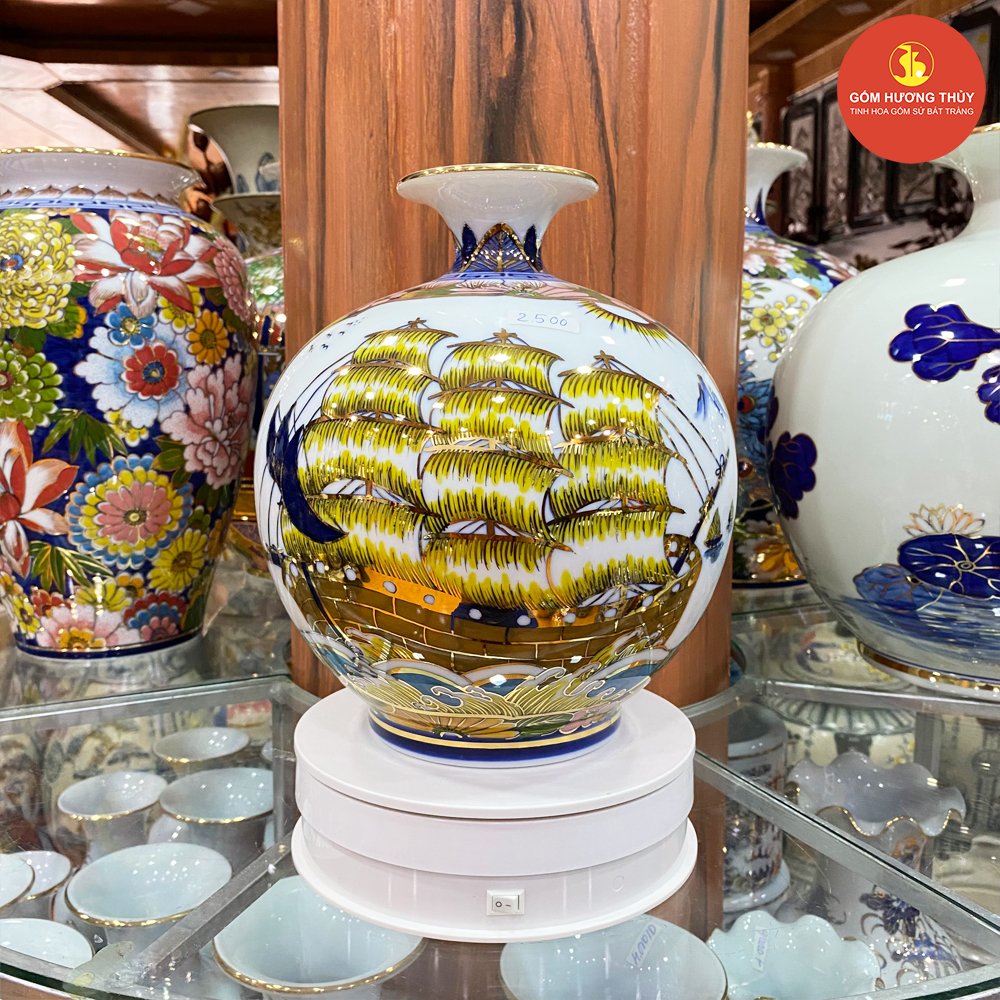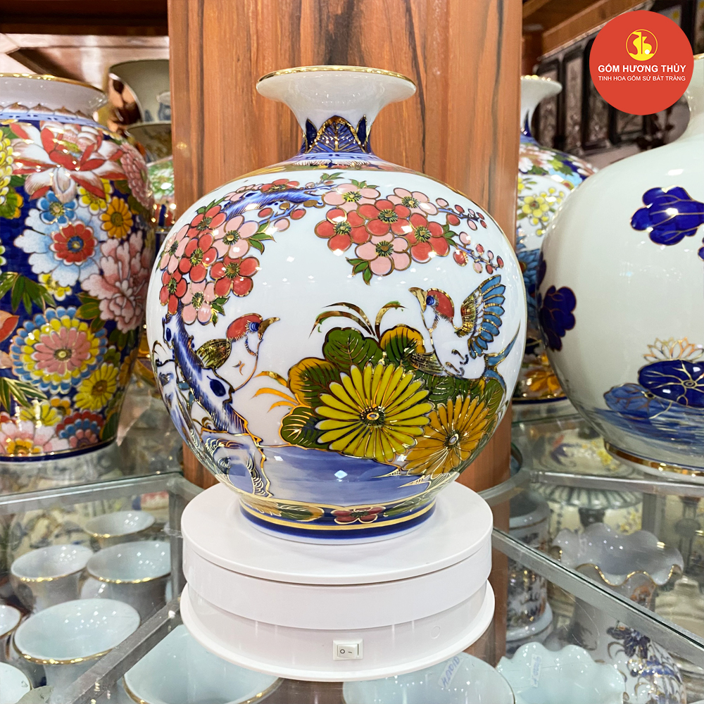 TÊN SẢN PHẨM: Bình hút lộc H25 nhị cảnh Thuyền - Chim hoa Vẽ vàng kim