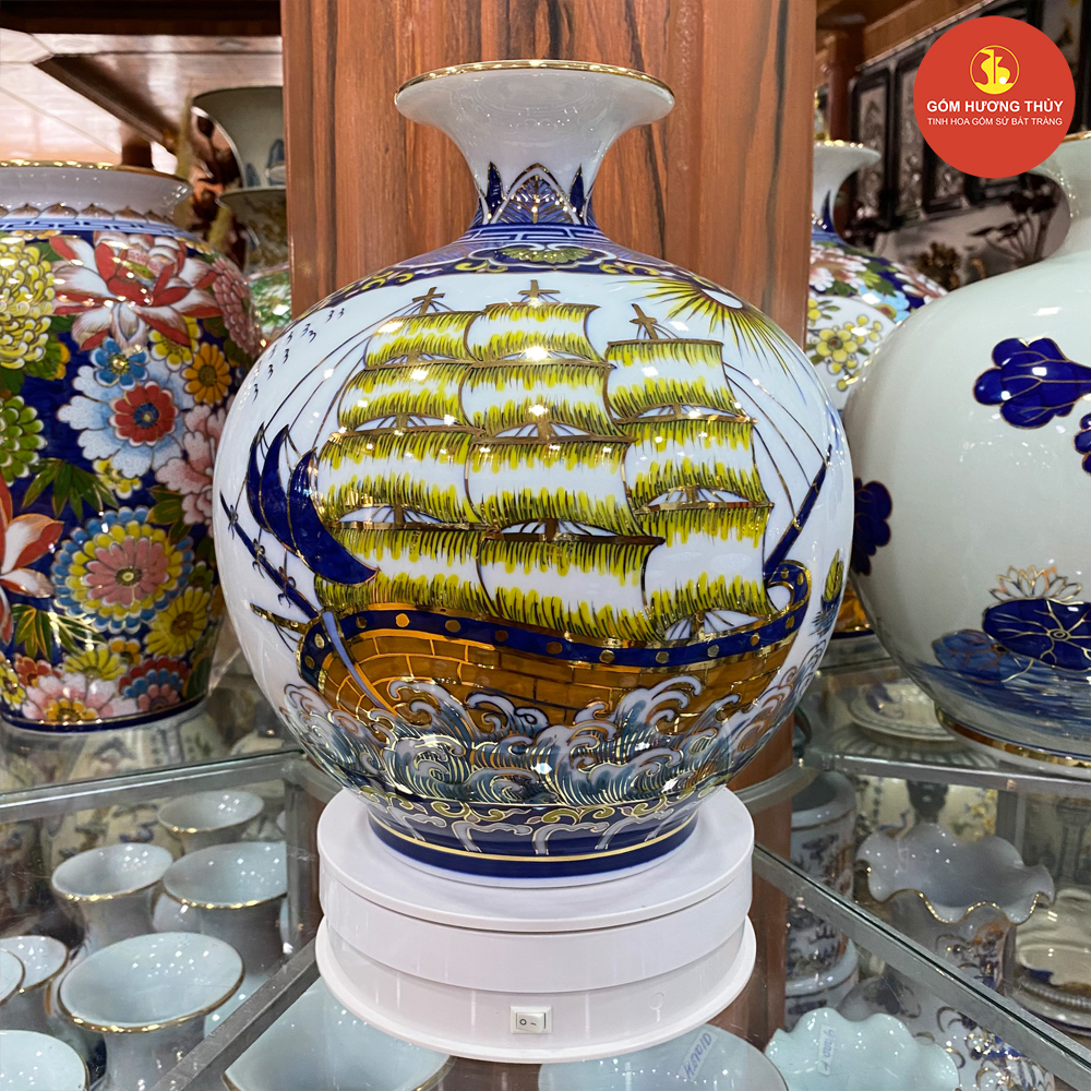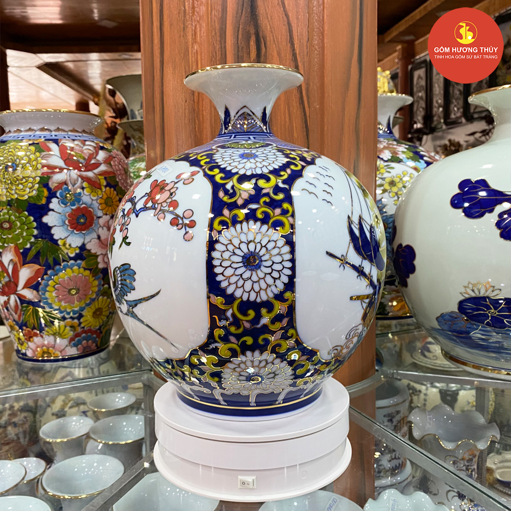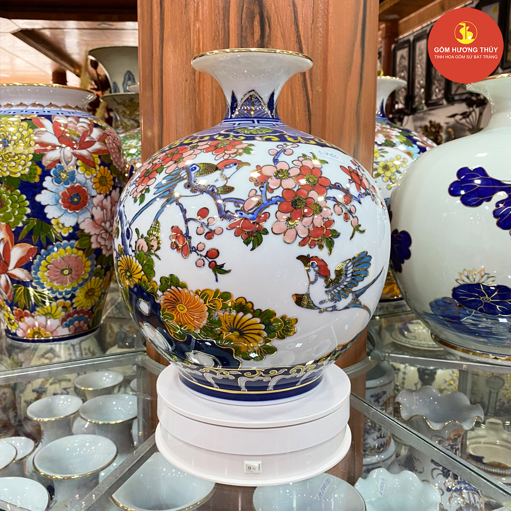 TÊN SẢN PHẨM: Bình hút lộc H30 Nhị cảnh khung thuyền - chim hoa nền trắng Vẽ vàng kim
