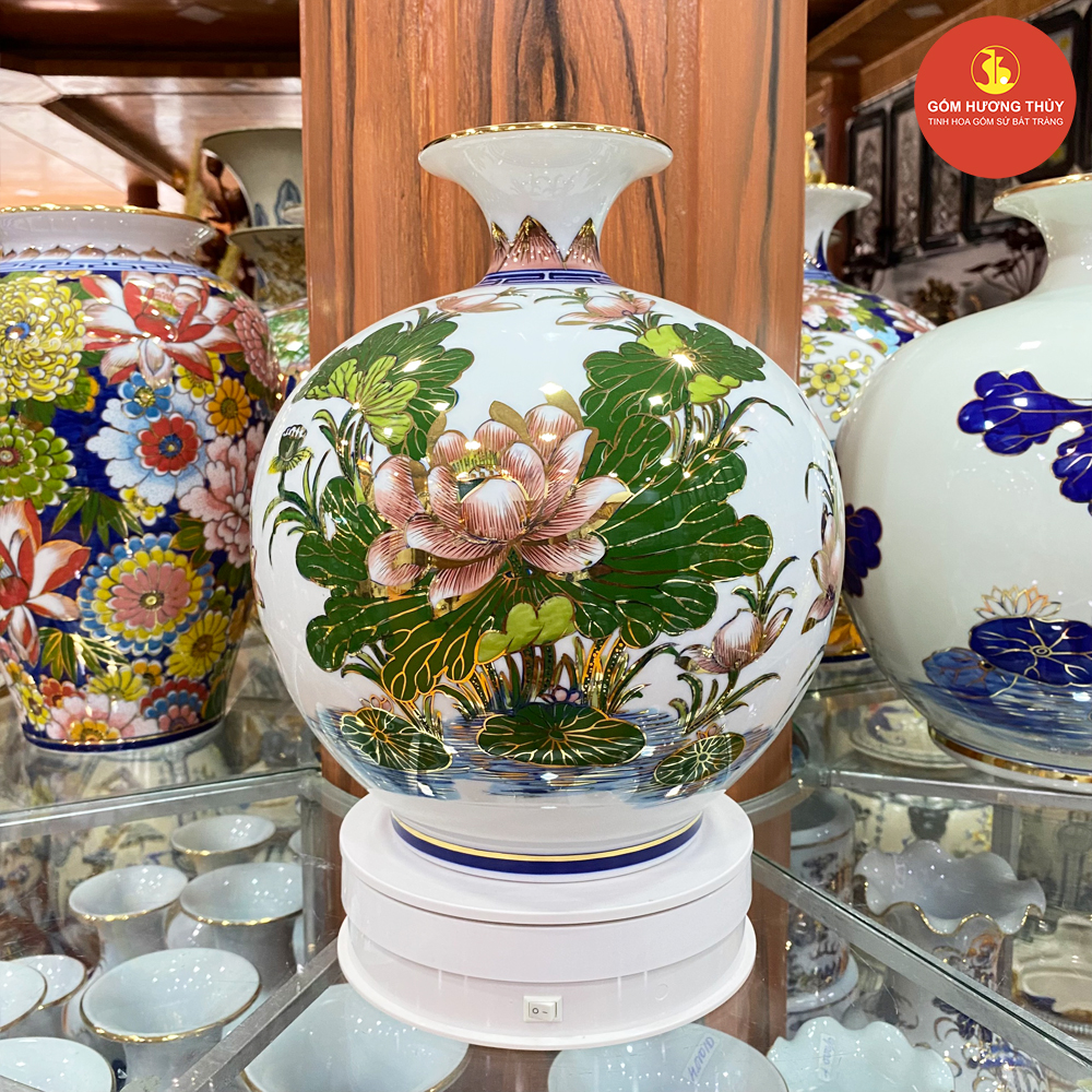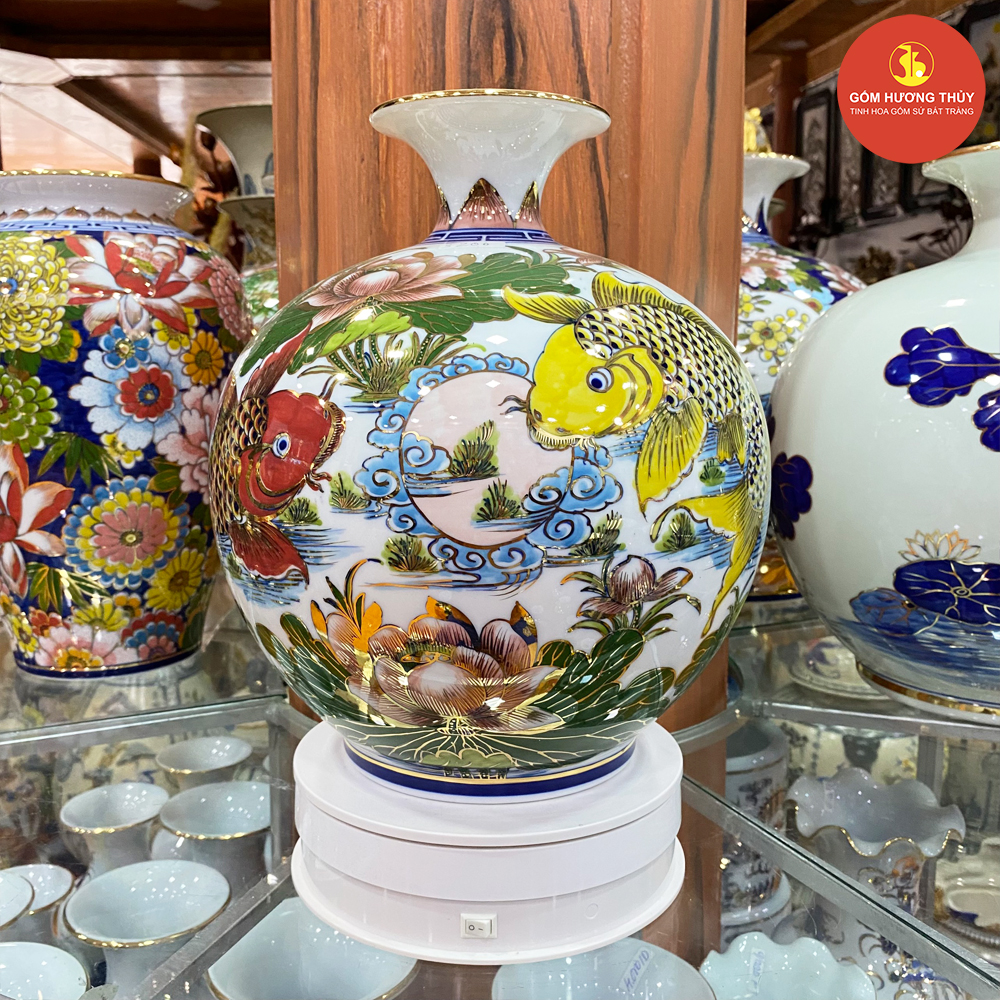 TÊN SẢN PHẨM: Bình hút lộc H30 Sen cá nền trắng Vẽ vàng kim