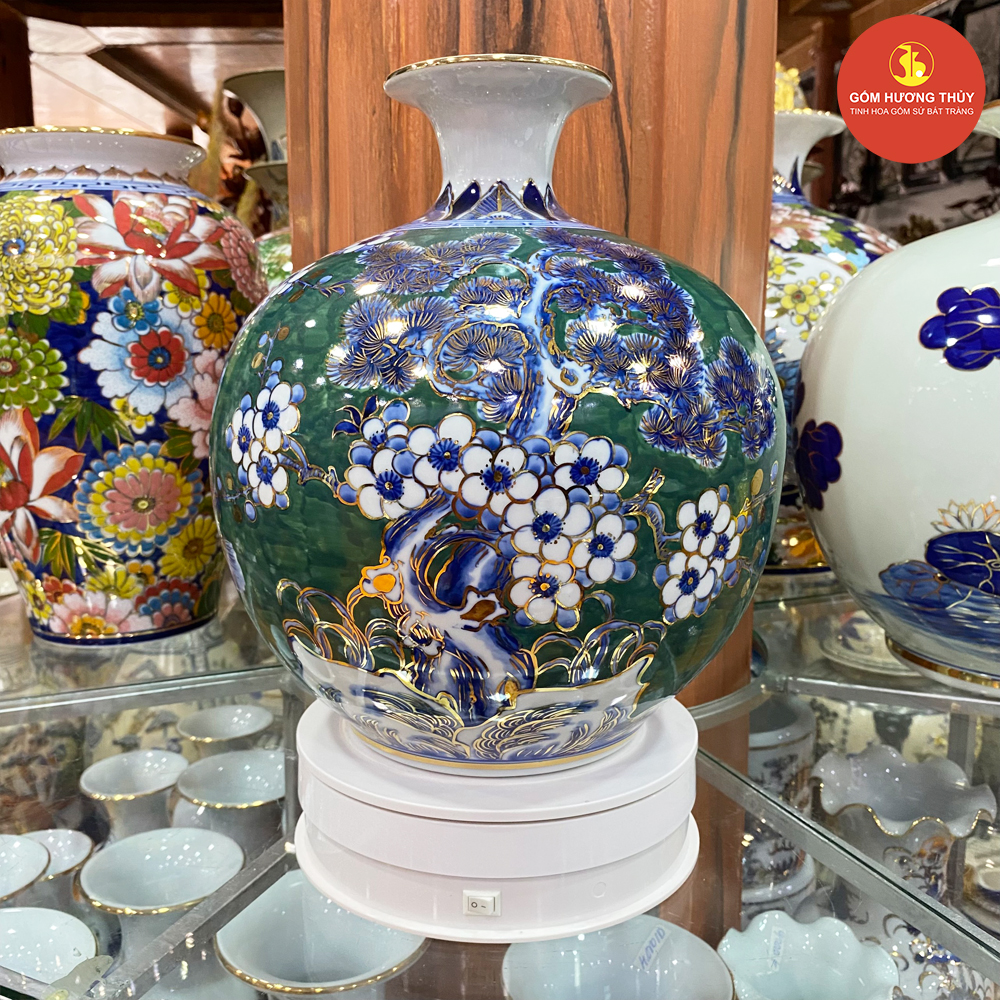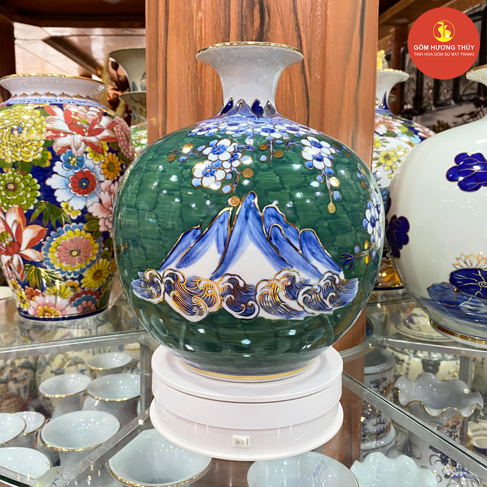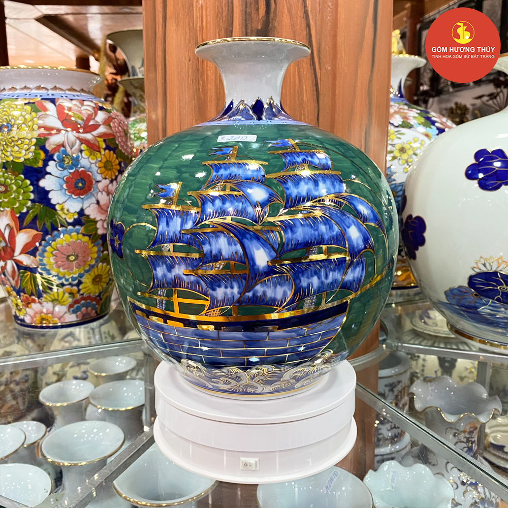 TÊN SẢN PHẨM: Bình hút lộc H30 Thuyền tùng nền xanh lục Vẽ vàng kim