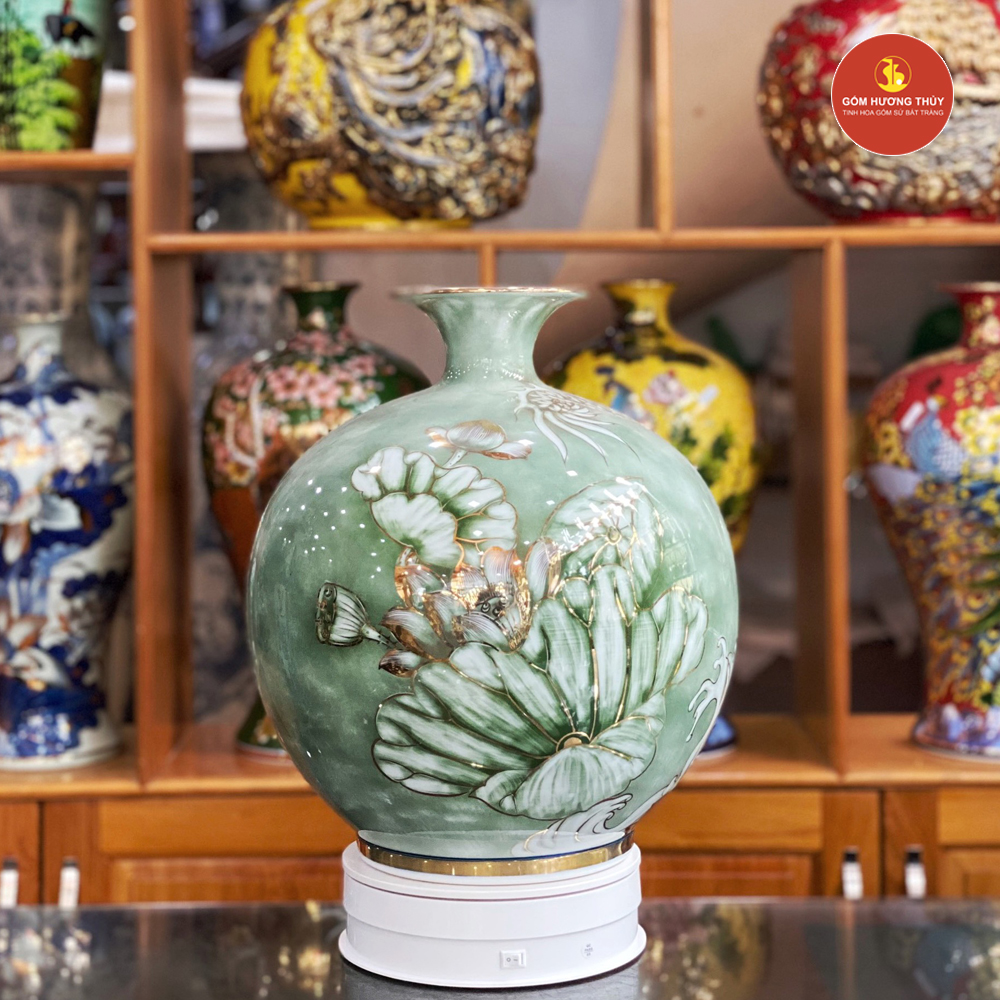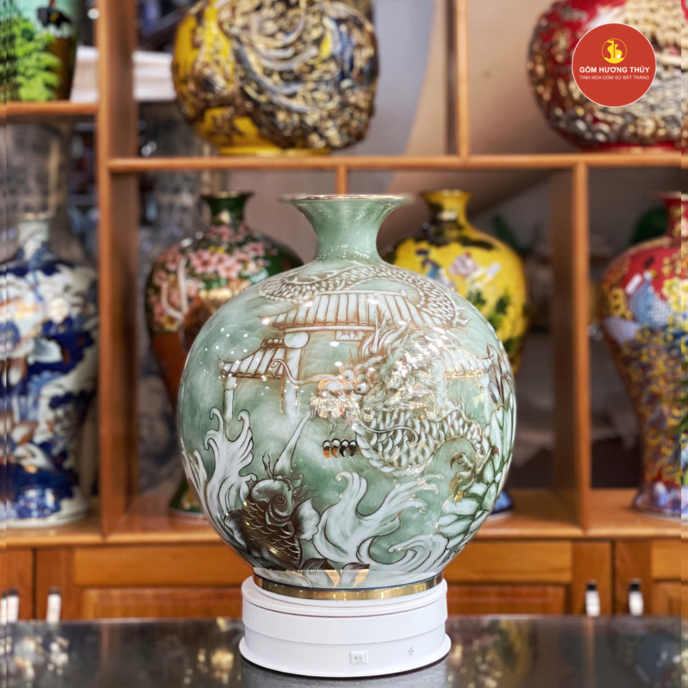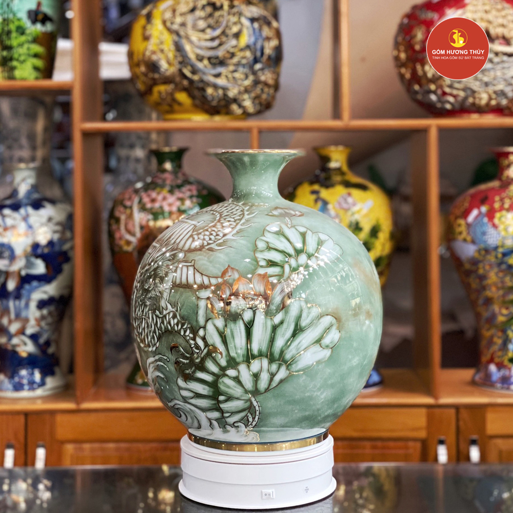 TÊN SẢN PHẨM: Bình Hút Lộc H35 Cá Chép Hóa Rồng nền Xanh ngọc Vẽ Vàng 24K