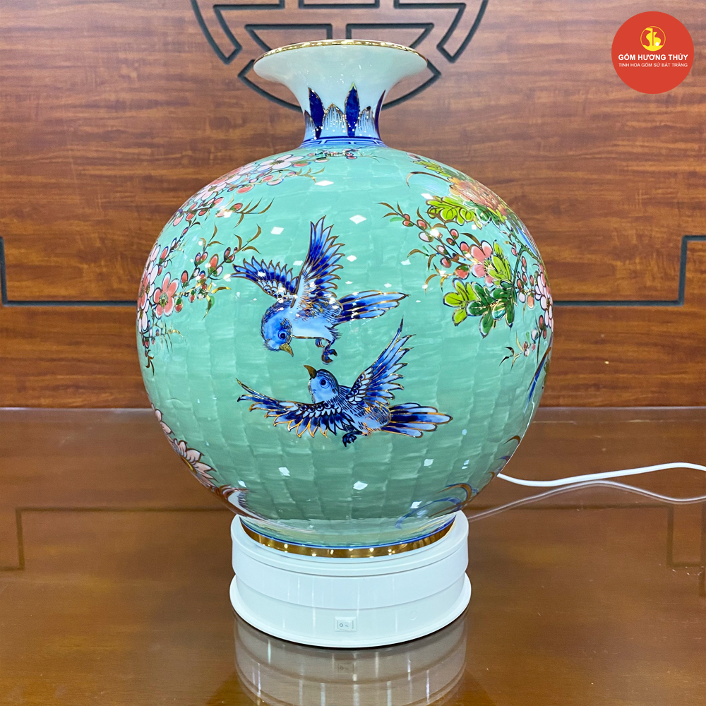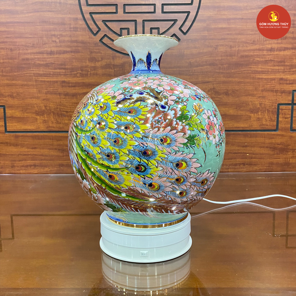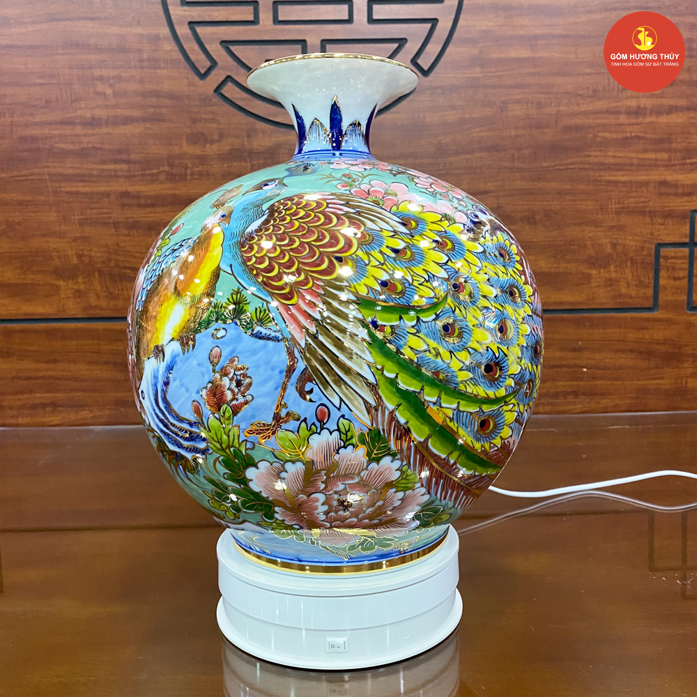 TÊN SẢN PHẨM: Bình hút lộc H35 Chim công nền xanh lơ Vẽ vàng 24K
