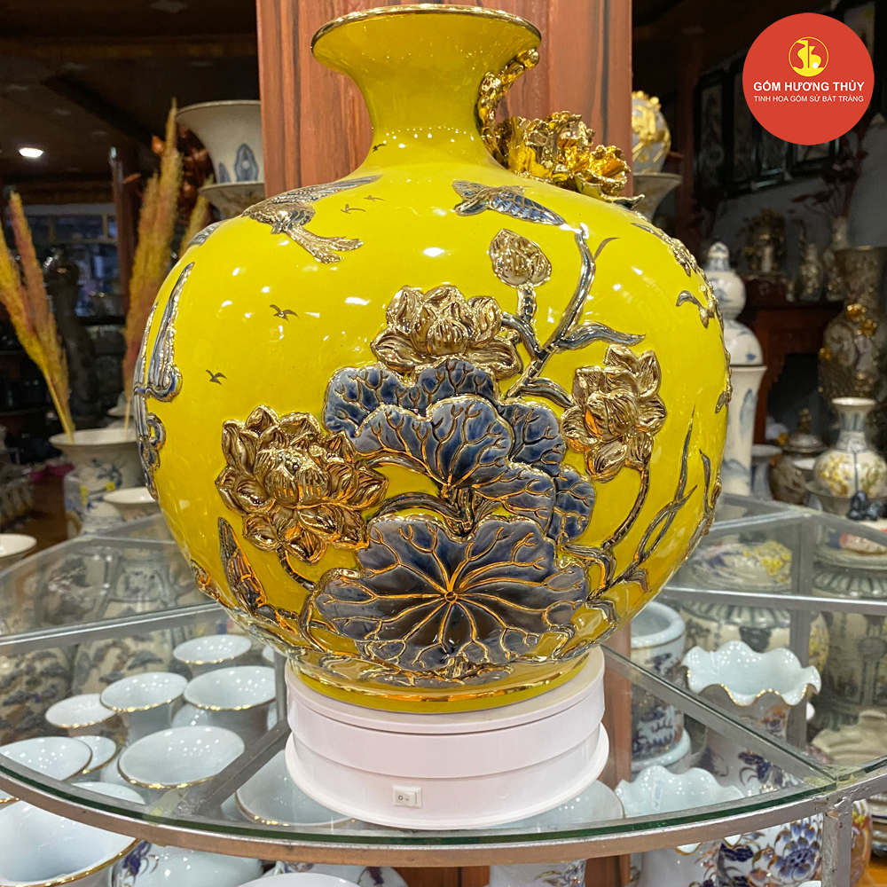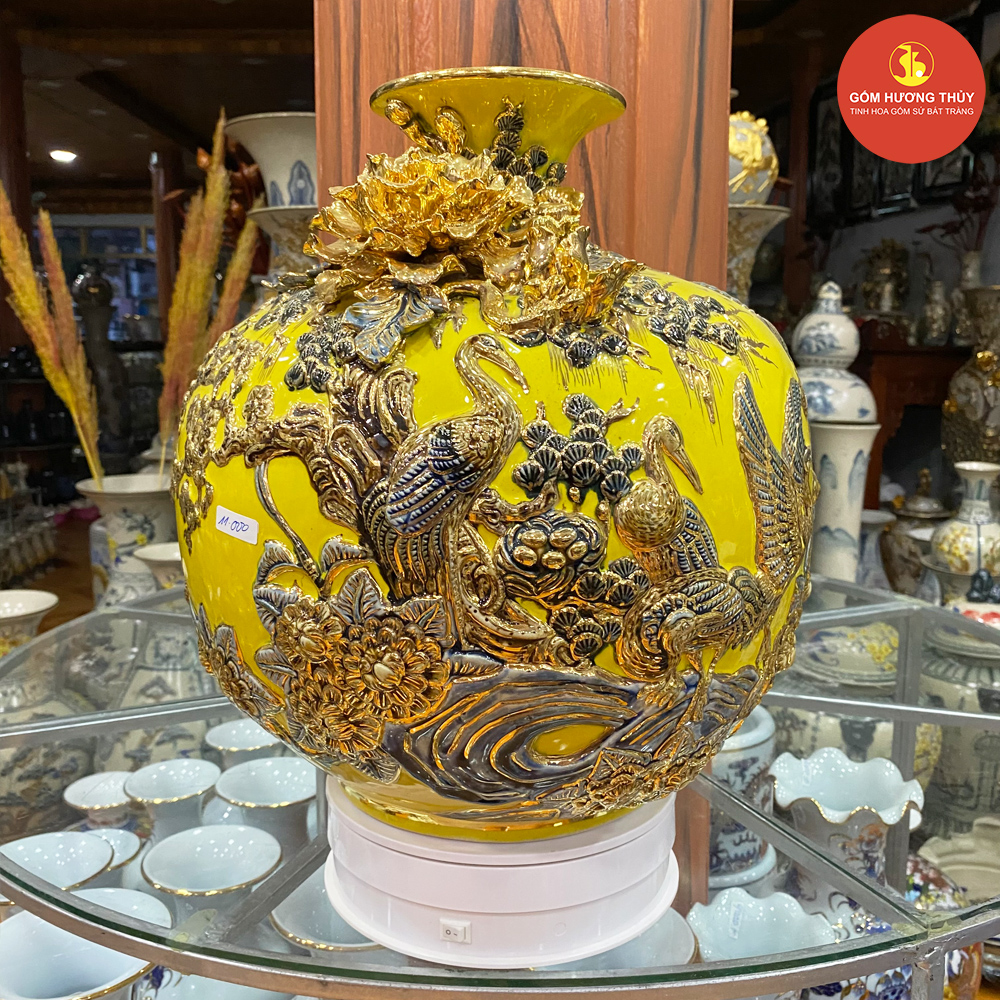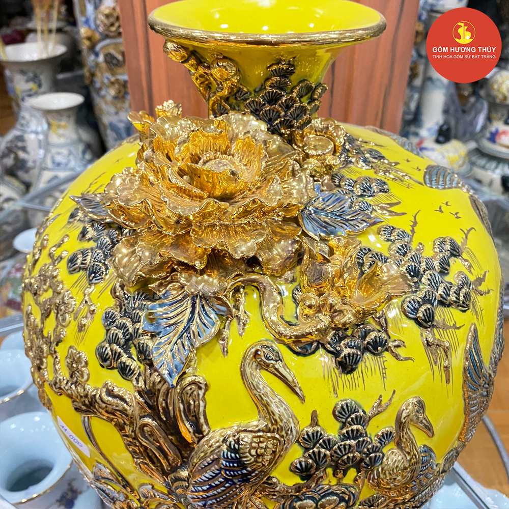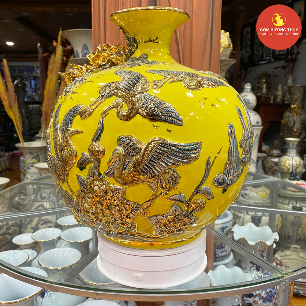 TÊN SẢN PHẨM: Bình hút lộc H35 Chim hạc đắp nổi nền vàng Vẽ vàng kim