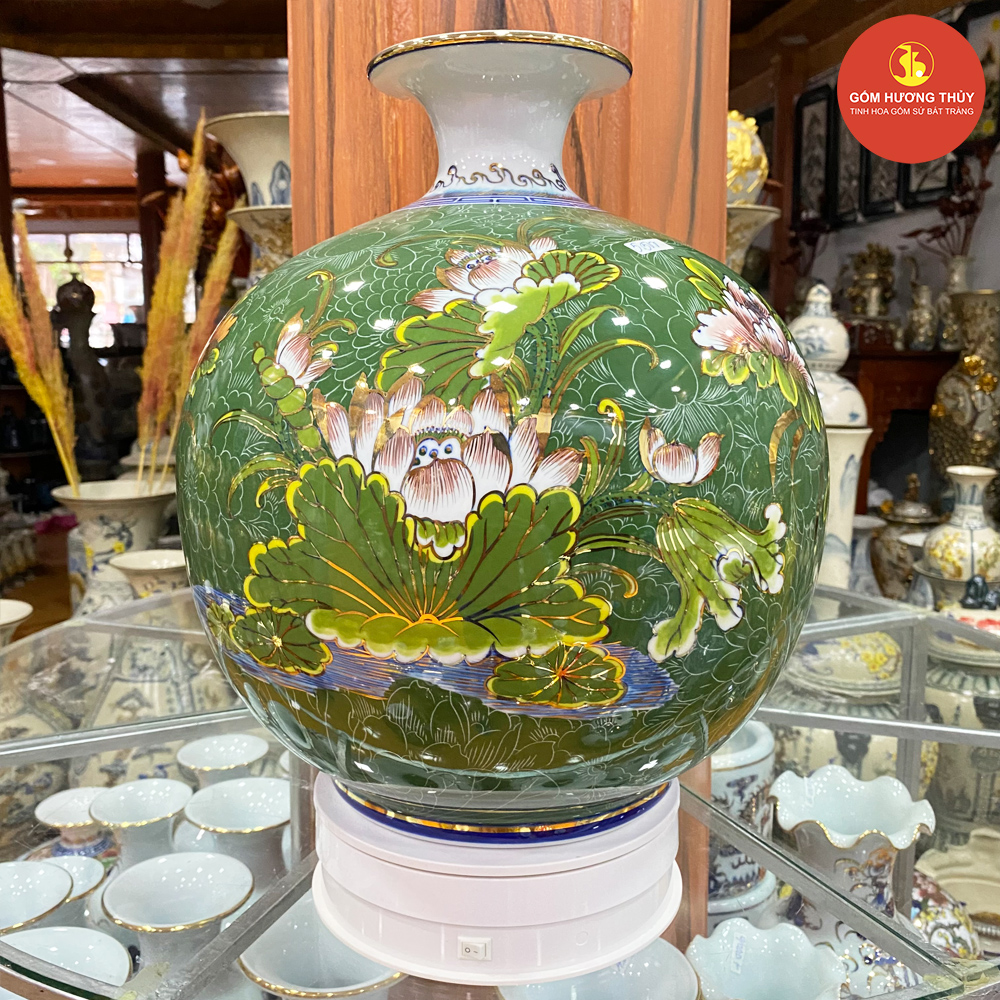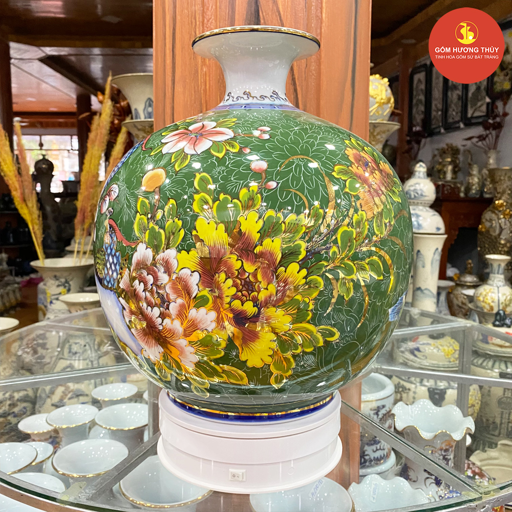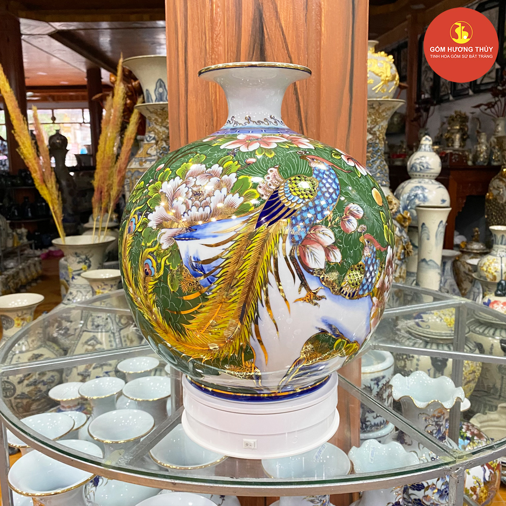 TÊN SẢN PHẨM: Bình hút lộc H35 Chim trĩ nền xanh lá Vẽ vàng kim