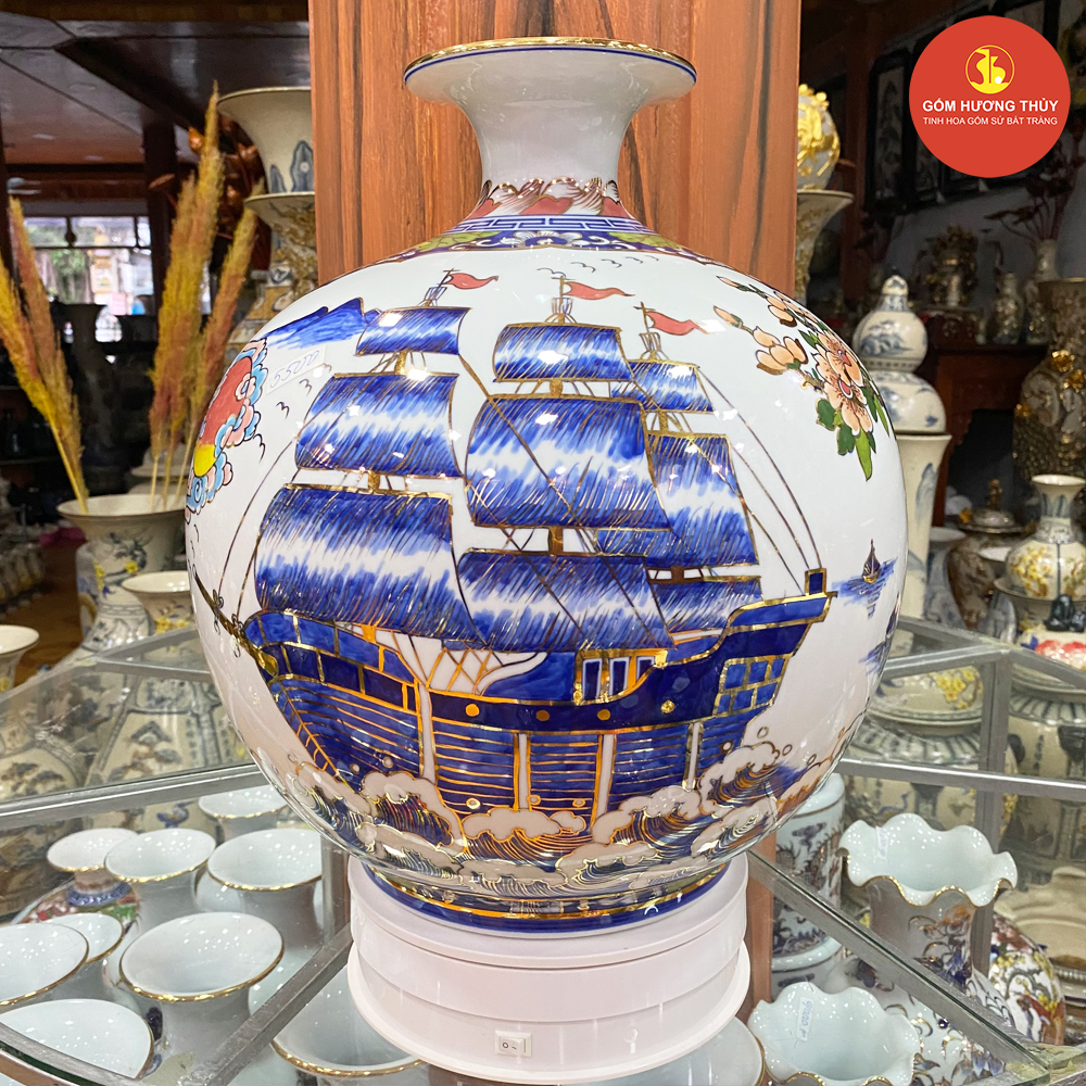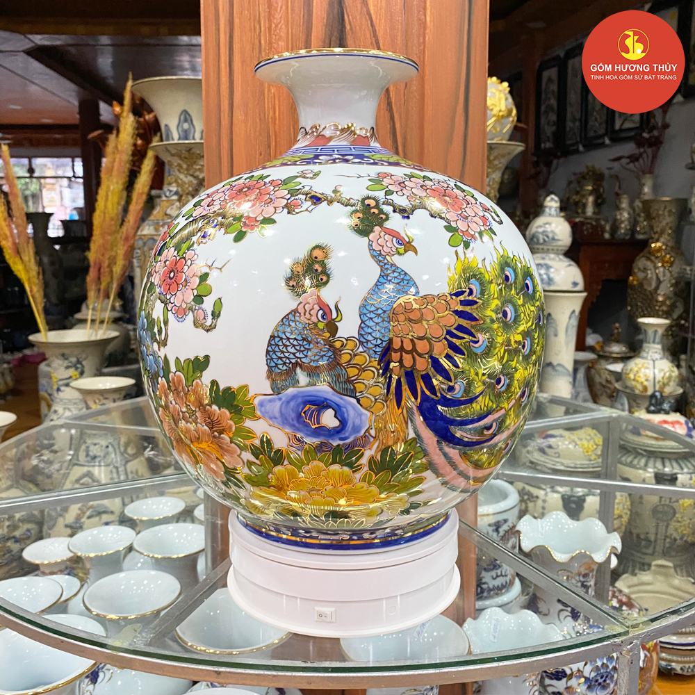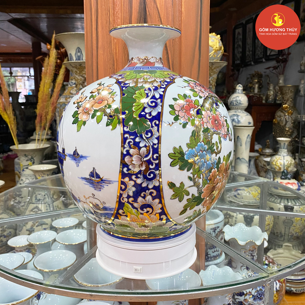 TÊN SẢN PHẨM: Bình hút lộc H35 Nhị cảnh khung Thuyền - Chim Hoa Vẽ vàng kim