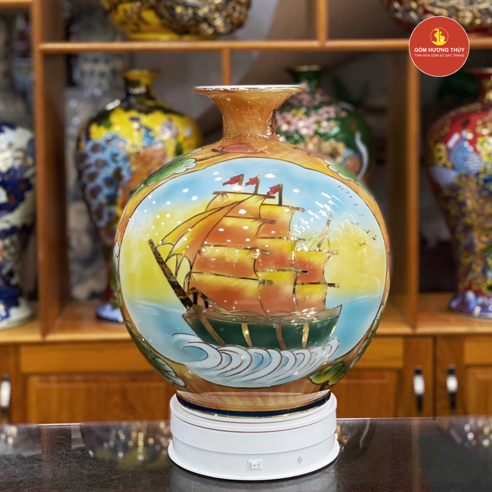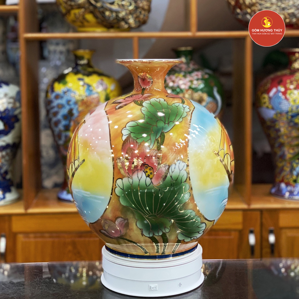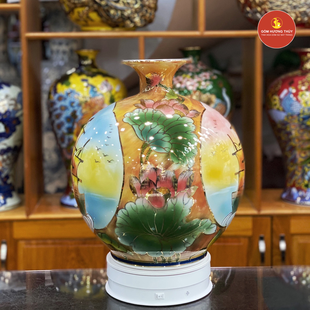 TÊN SẢN PHẨM: Bình Hút Lộc H35 Nhị cảnh Thuyền nền Sen Vẽ Vàng 24K