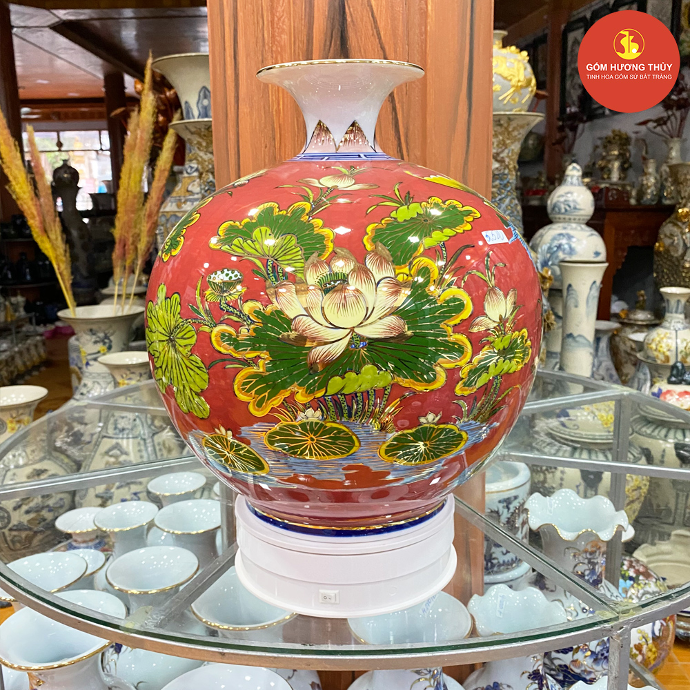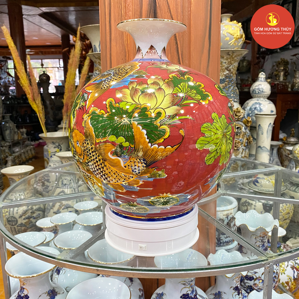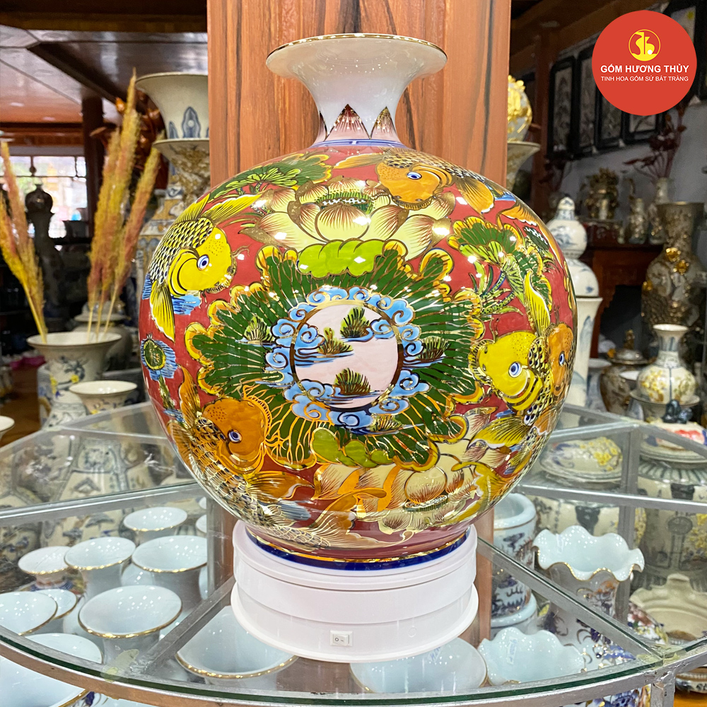 TÊN SẢN PHẨM: Bình hút lộc H35 Sen cá nền đỏ Vẽ vàng kim