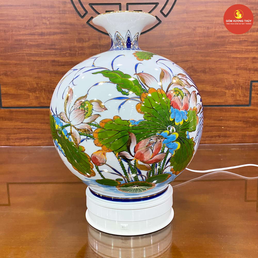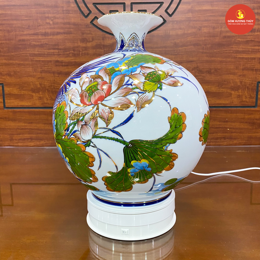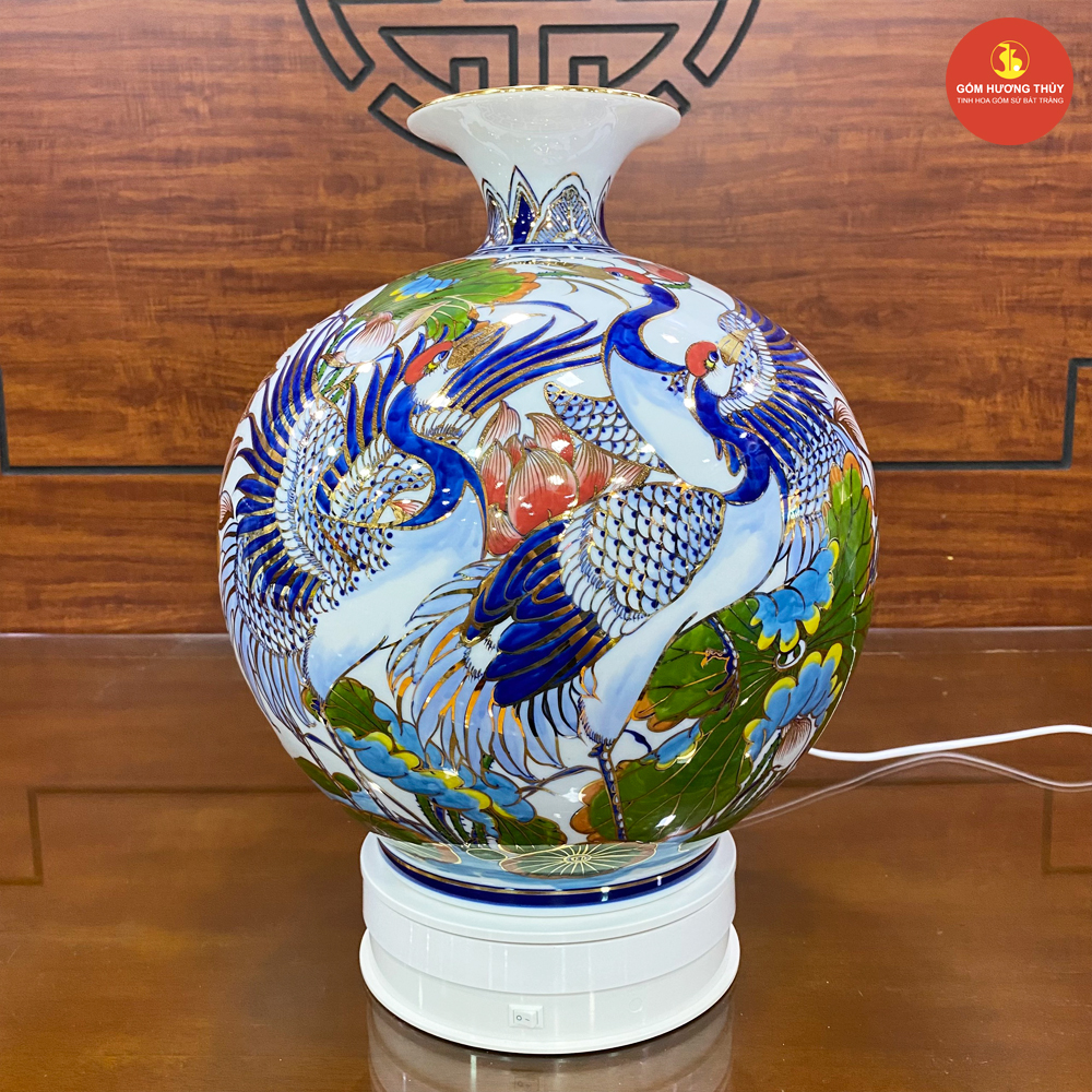 TÊN SẢN PHẨM: Bình hút lộc H35 Sen hạc nền trắng Vẽ vàng 24K