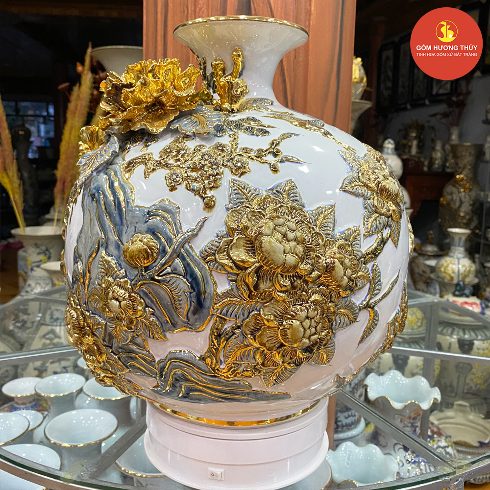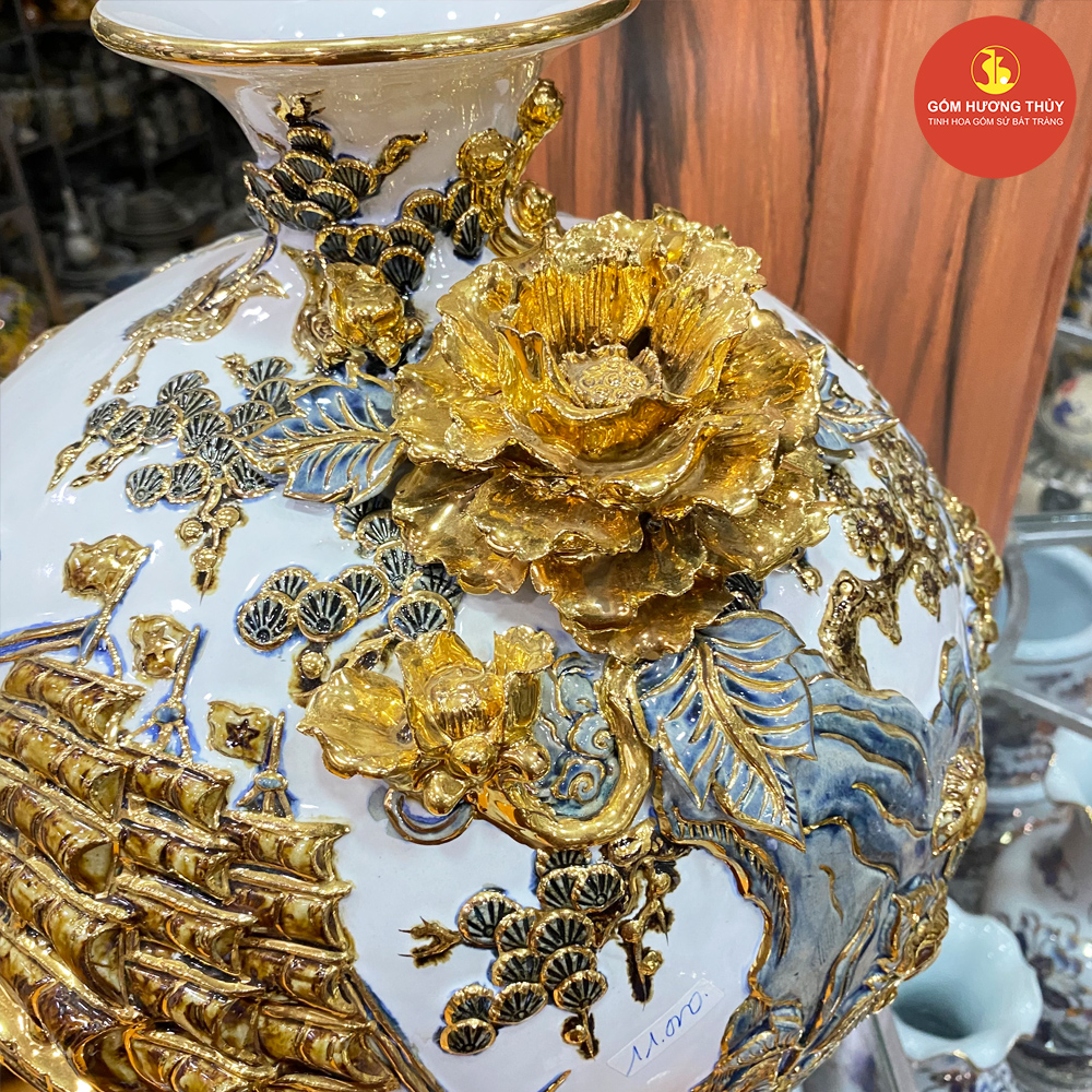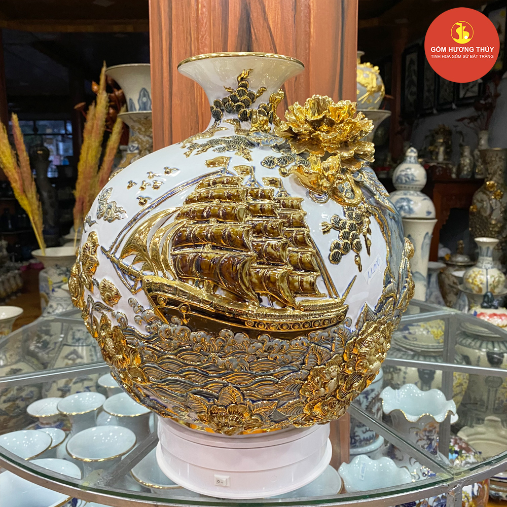 TÊN SẢN PHẨM: Bình hút lộc H35 Thuyền đắp nổi nền trắng Vẽ vàng kim