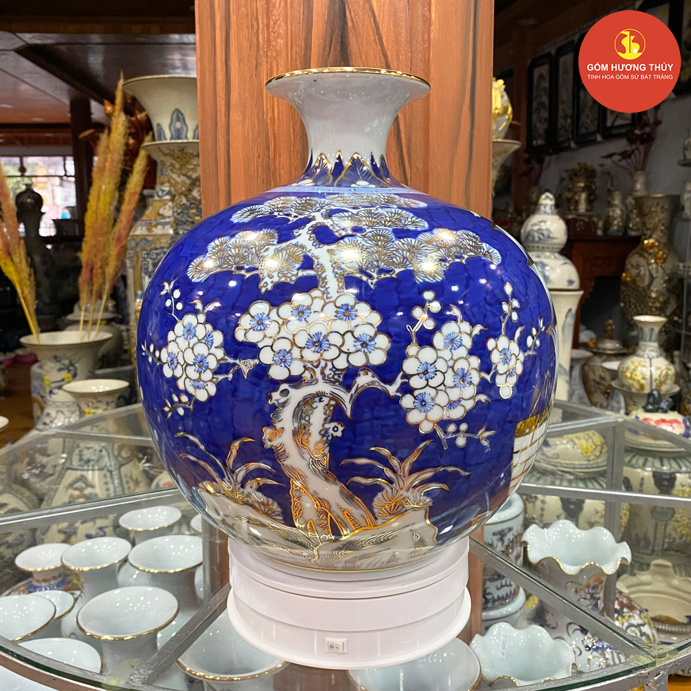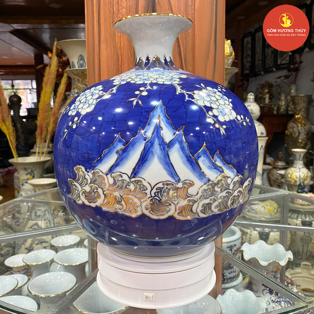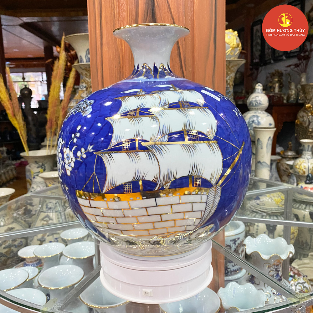 TÊN SẢN PHẨM: Bình hút lộc H35 Thuyền tùng nền xanh coban Vẽ vàng kim