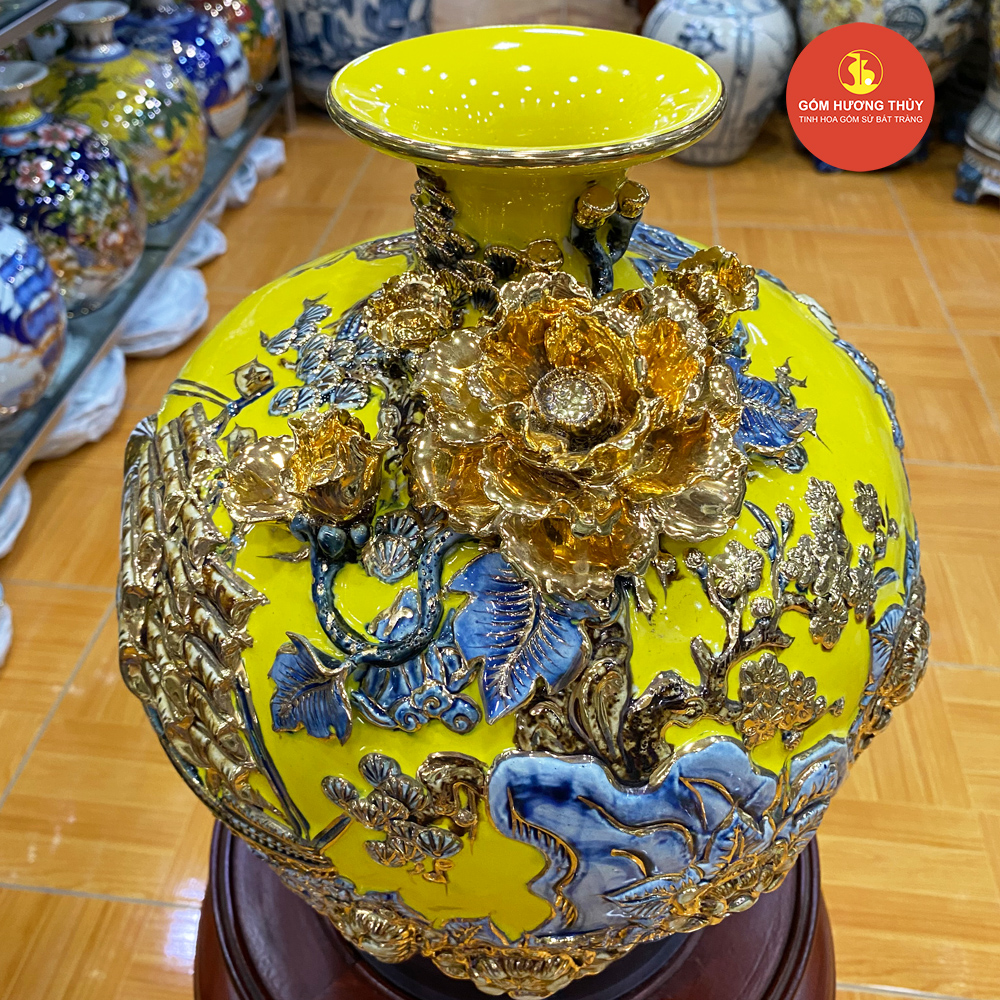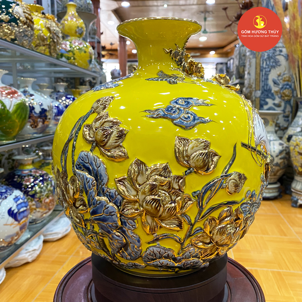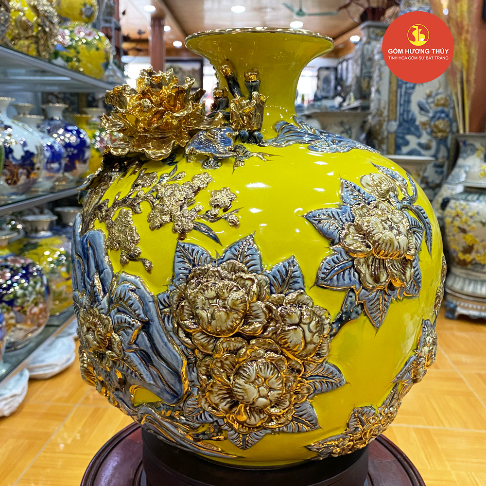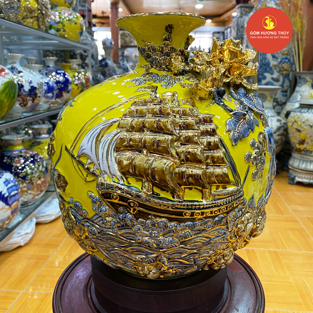 TÊN SẢN PHẨM: Bình hút lộc Thuận buồm đắp nổi Vẽ vàng H30 Nền Vàng