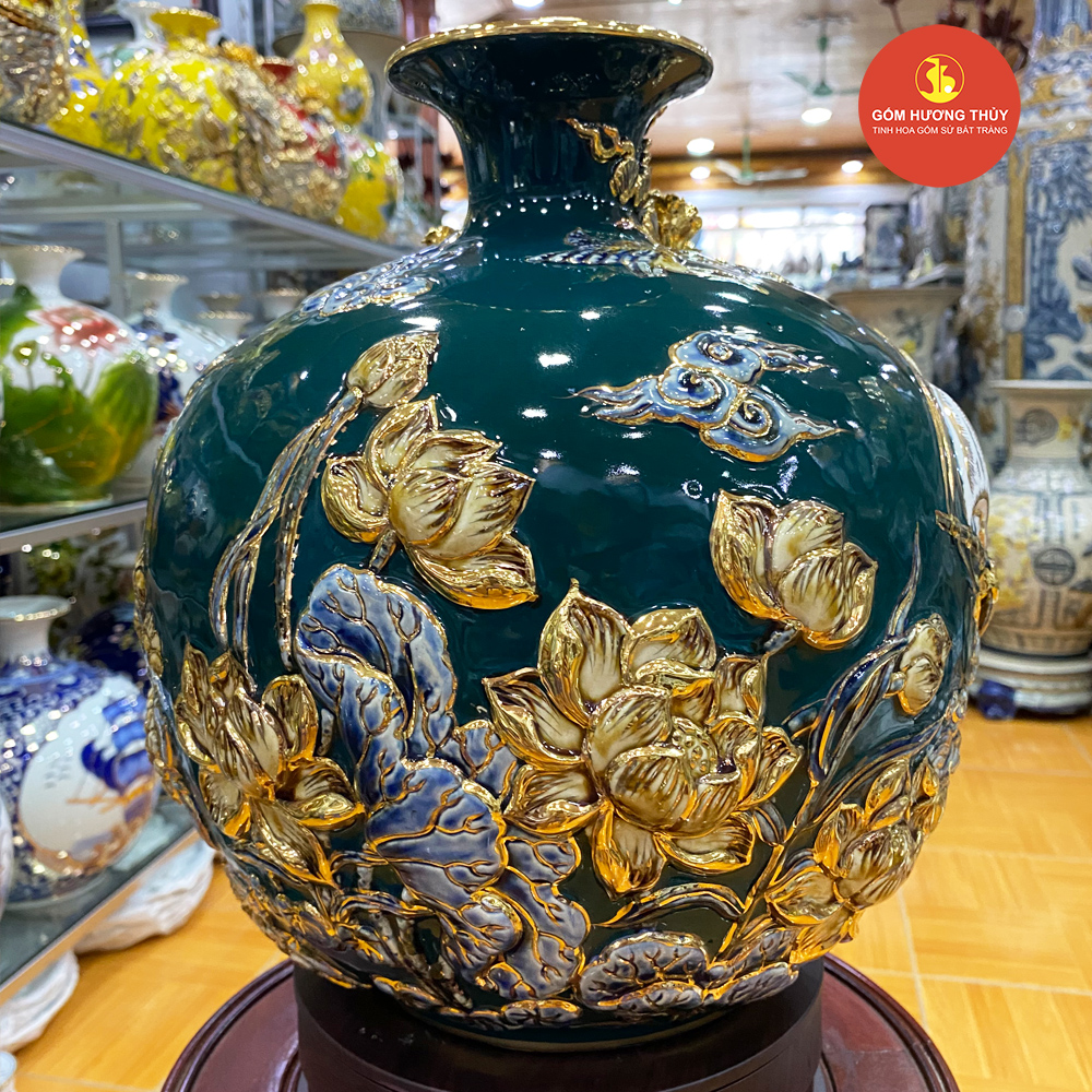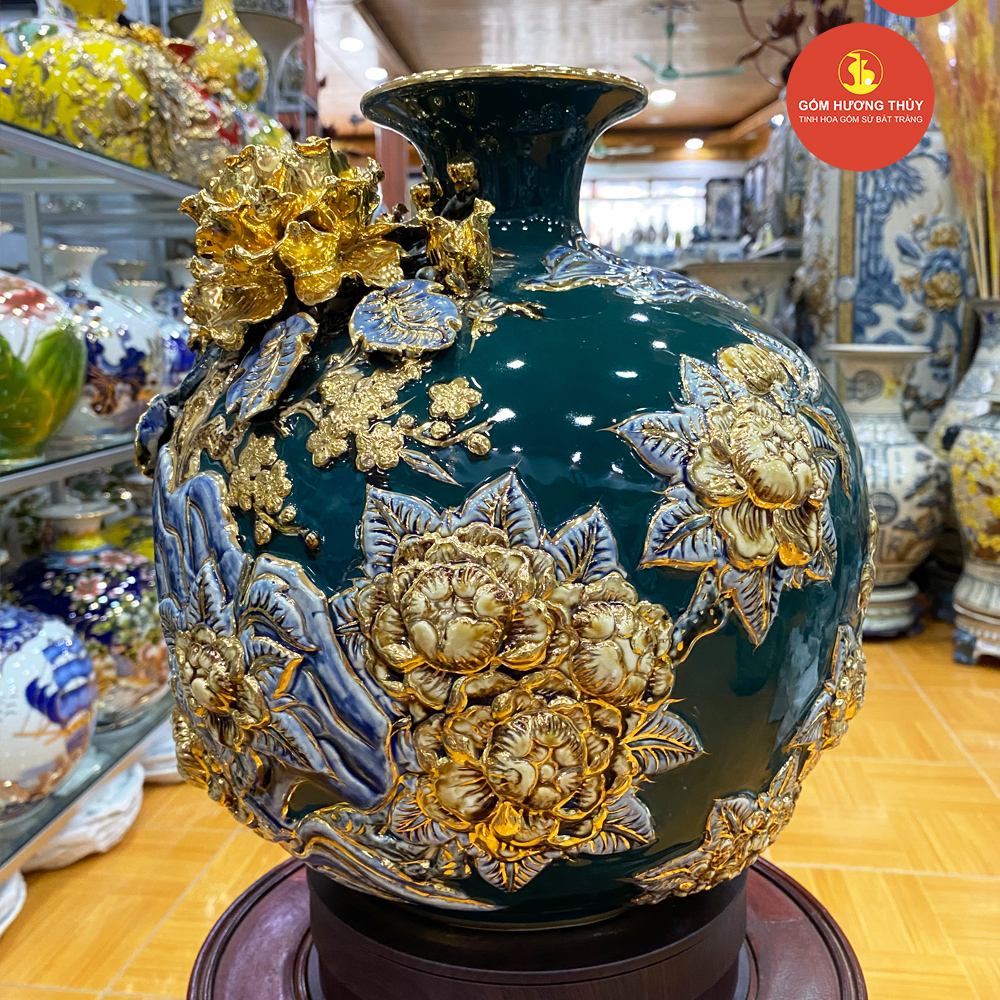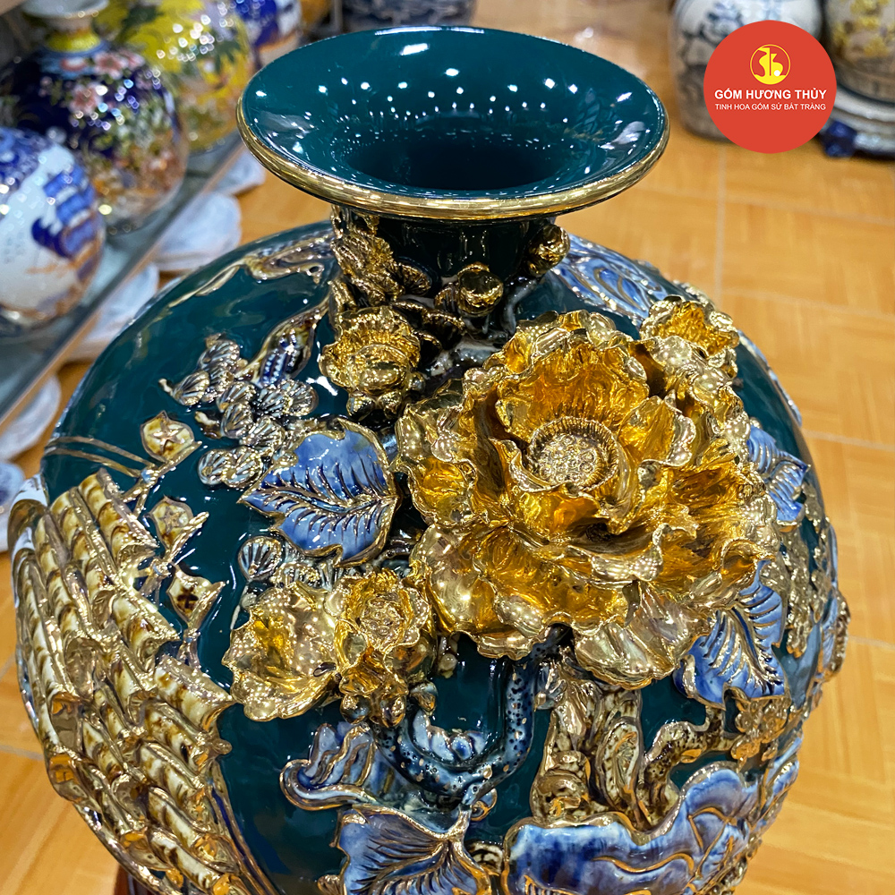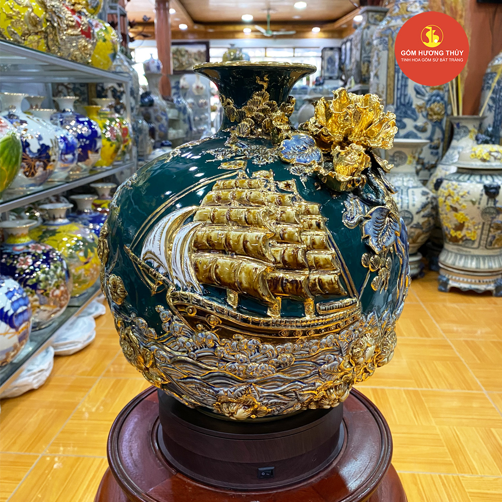TÊN SẢN PHẨM: Bình hút lộc Thuận buồm đắp nổi Vẽ vàng H30 Nền Xanh Lục