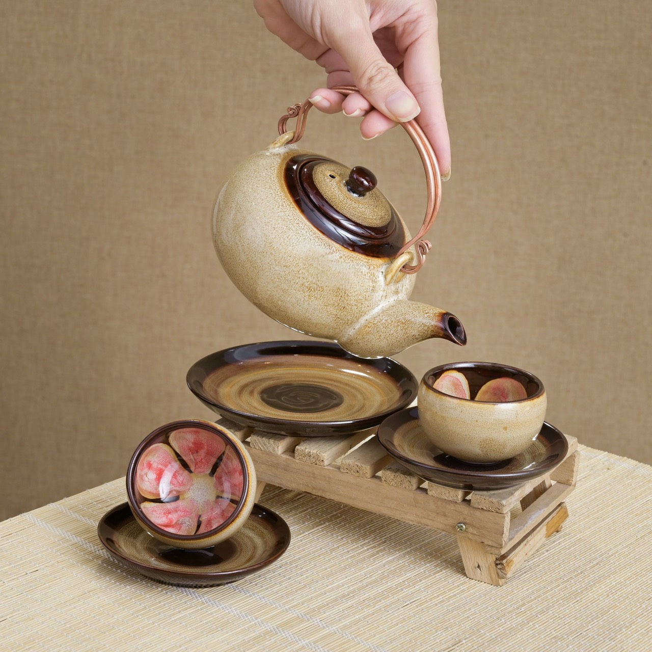 TÊN SẢN PHẨM: Bộ ấm chén hoả biến quai đồng 300ml