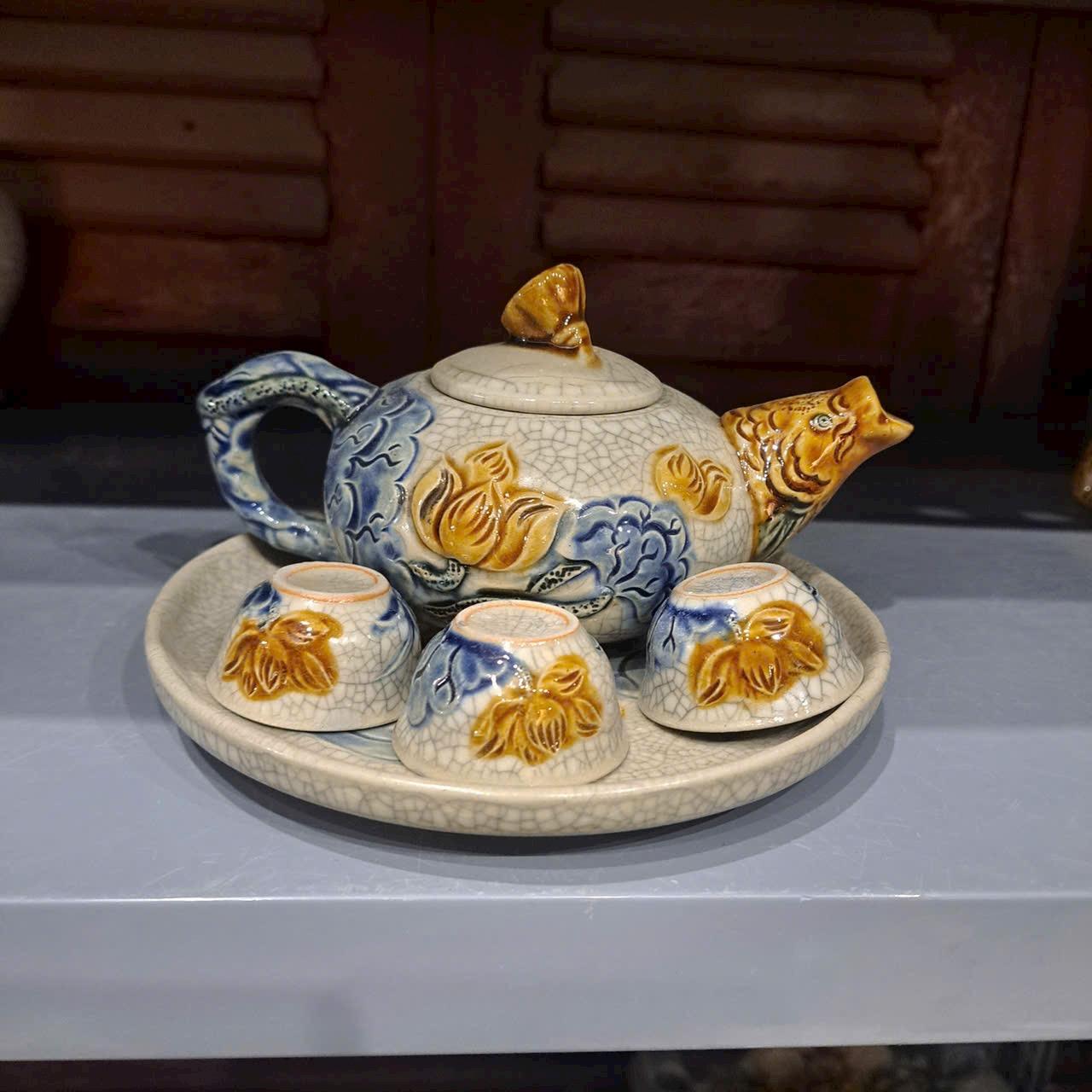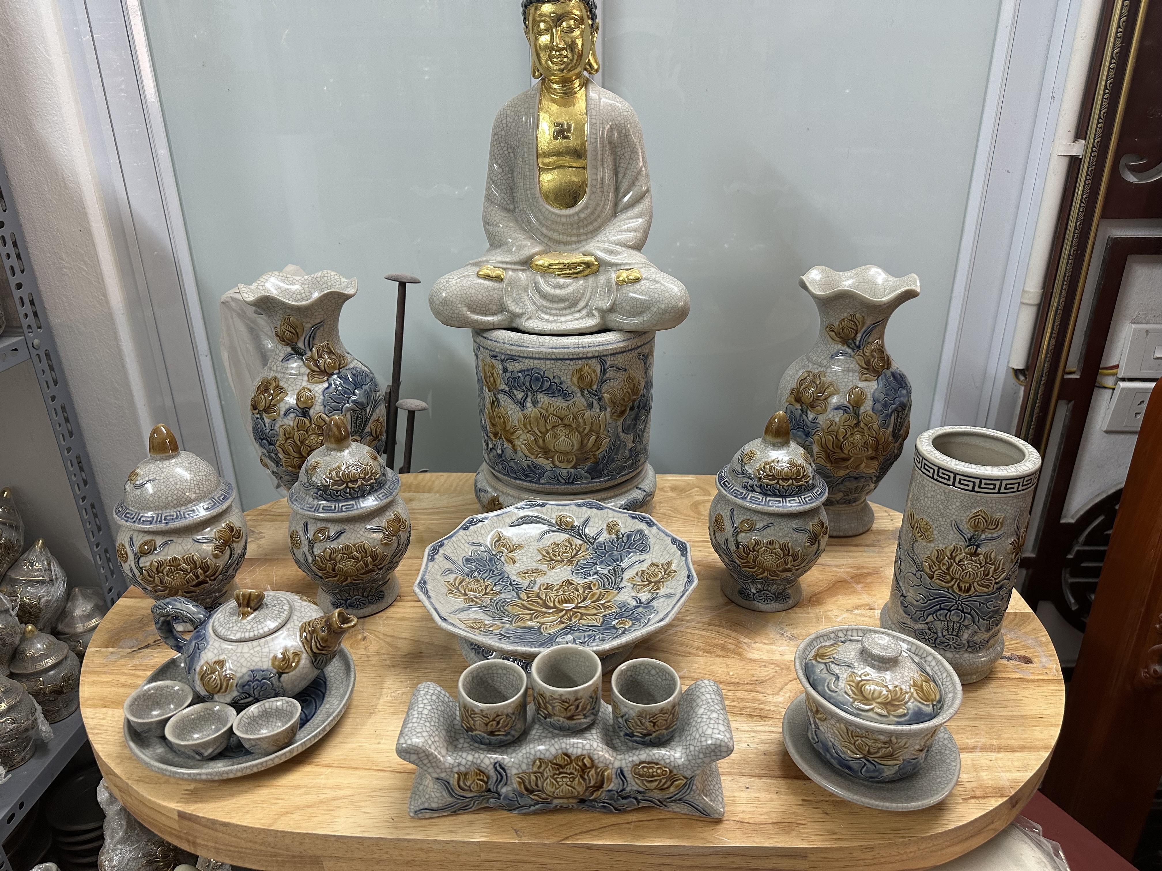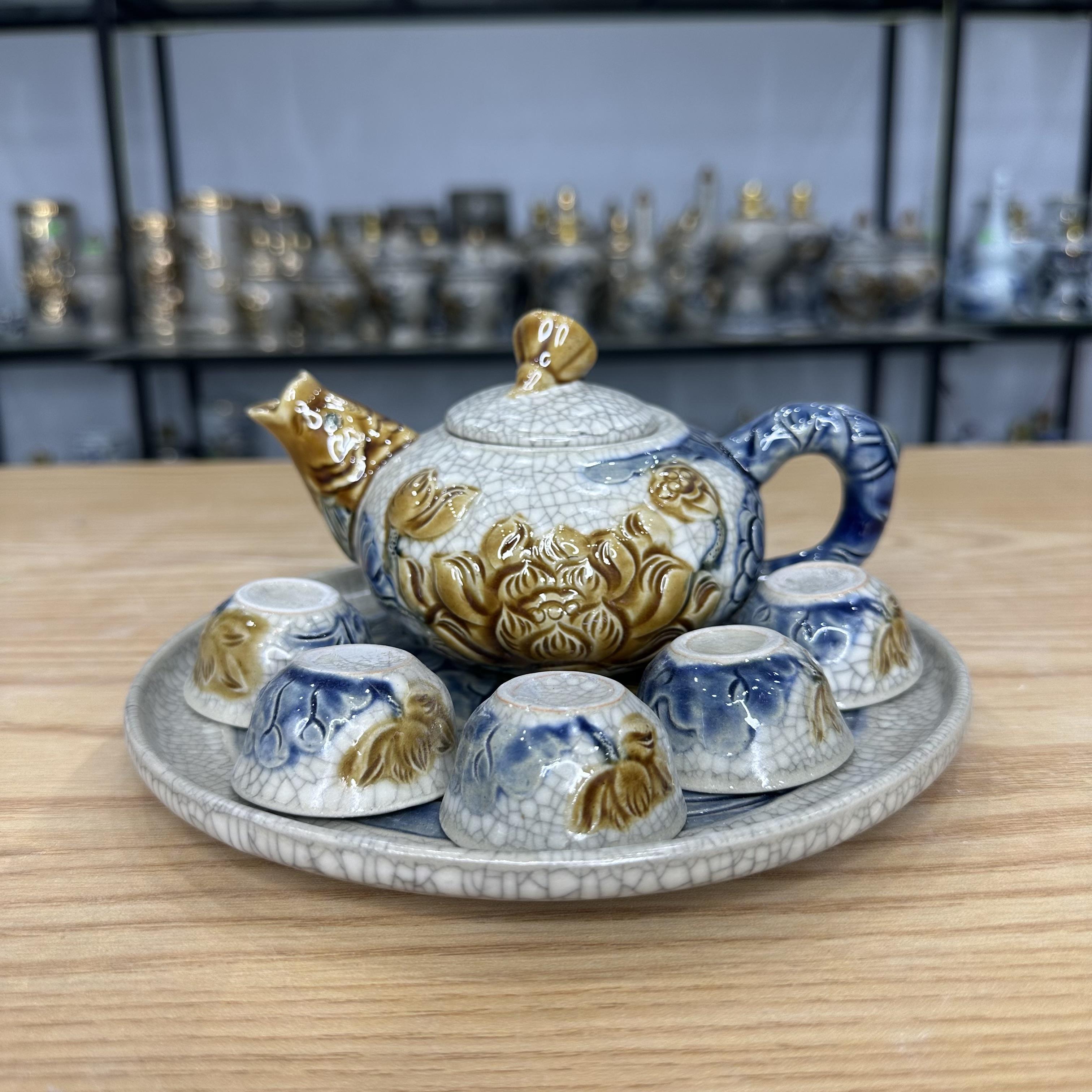 Bộ trà thờ men rạn nổi vẽ Sen [GỐM SỨ BÁT TRÀNG]