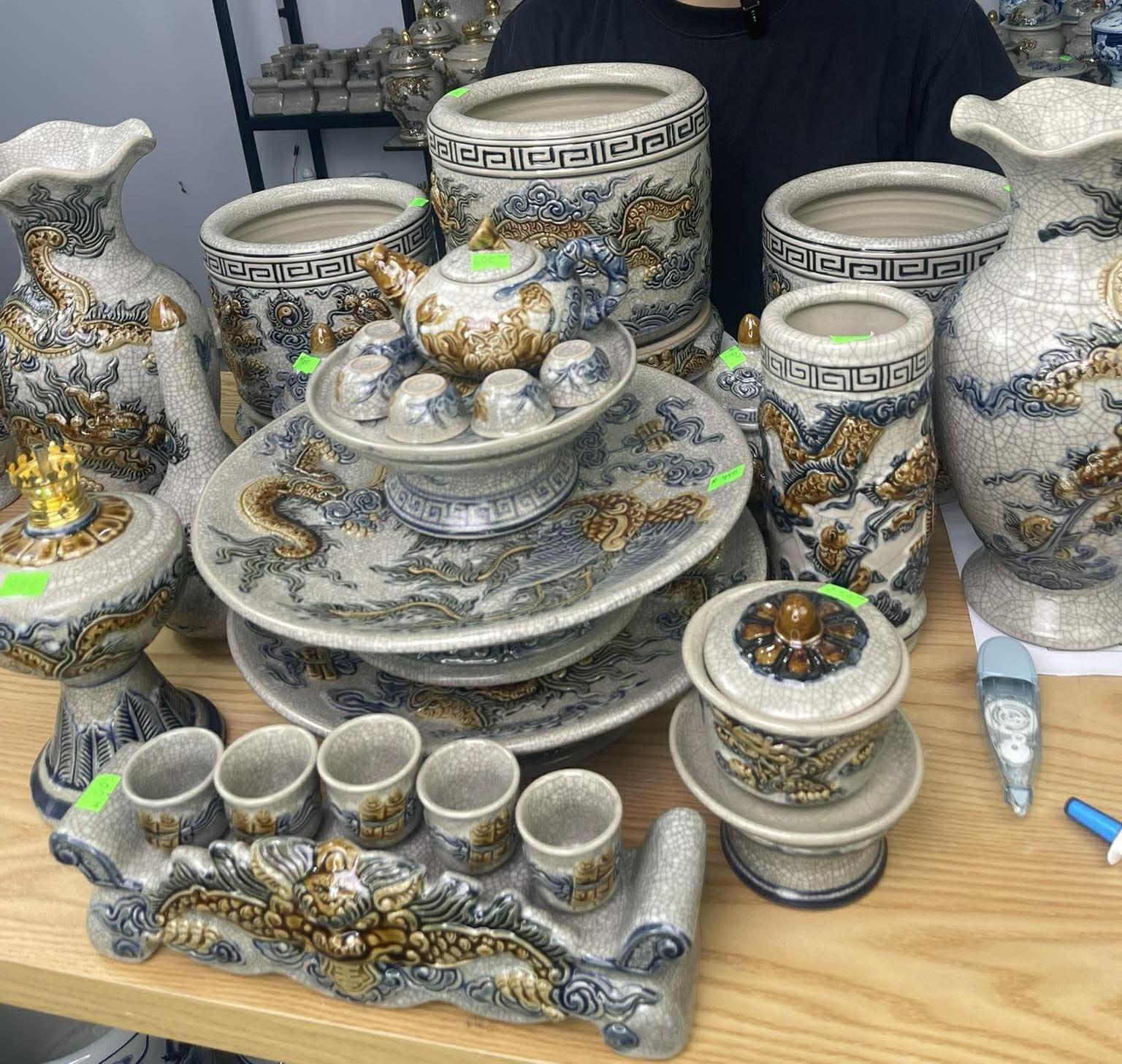 * Các hoa văn họa tiết như hình rồng, phượng, hoa, mây, sóng thủy ba,… được đắp nổi hoặc khắc chìm lên sản phẩm, các hoa văn này sẽ được sử dụng một loại men khác để vẽ lên, có thể là men ngọc, men nâu,… Sự kết hợp giữa các dòng men được người thợ Bát Tràng sử dụng nhuần nhuyễn và cho ra lò những sản phẩm đáp ứng nhu cầu cao của Khách hàng.