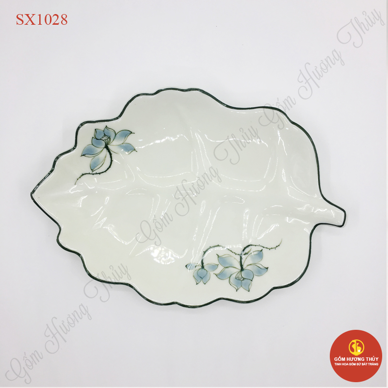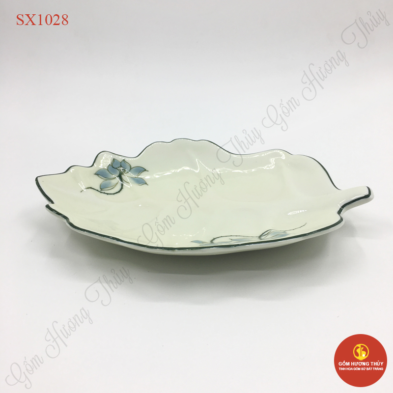 TÊN SẢN PHẨM: Đĩa lá bỏng men kem vẽ sen xanh