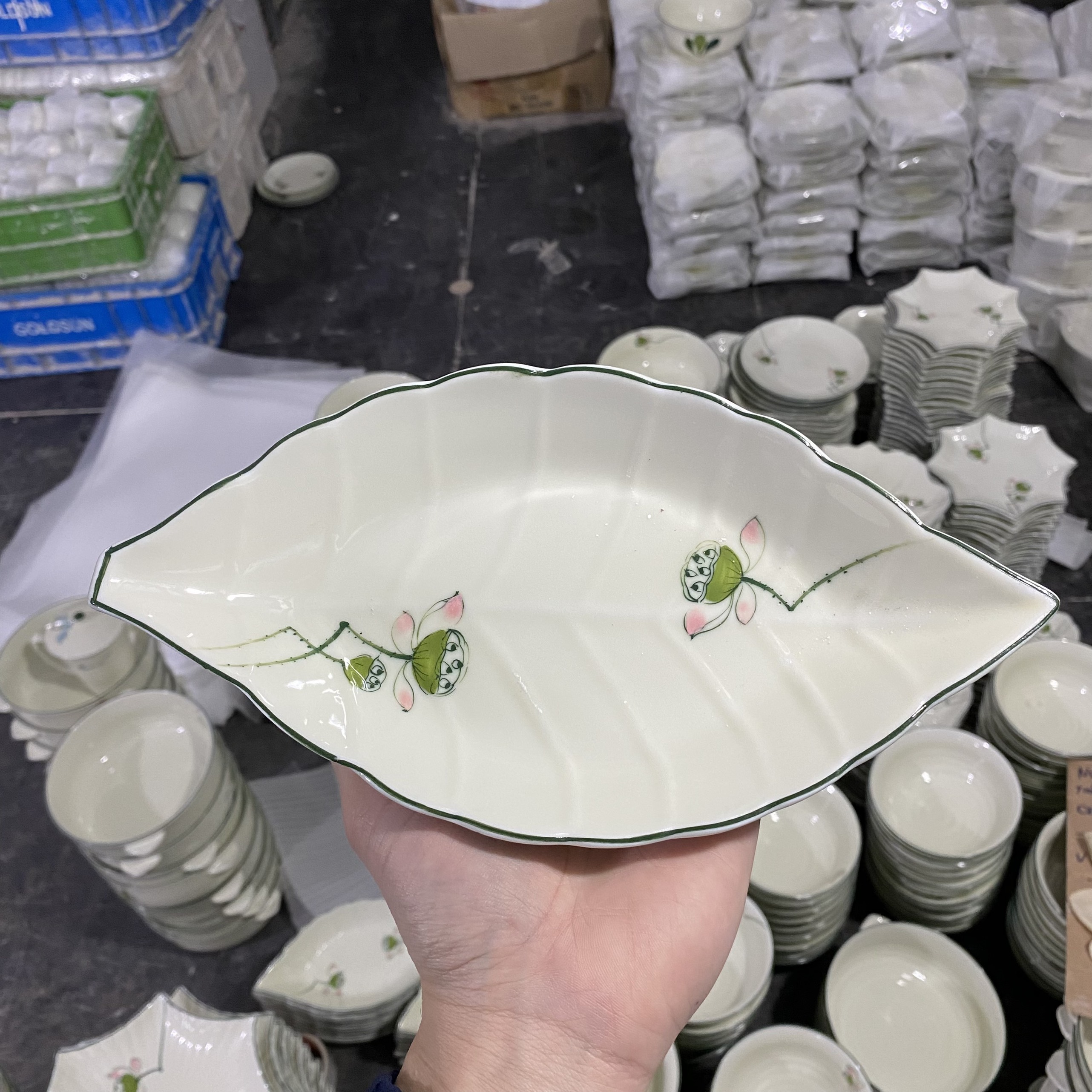TÊN SẢN PHẨM: Đĩa lá gân men kem vẽ đài sen