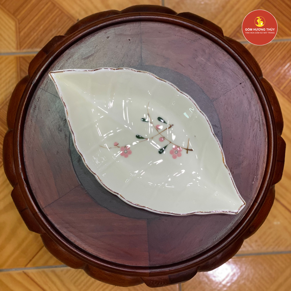 TÊN SẢN PHẨM: Đĩa lá gân men kem vẽ đào hồng