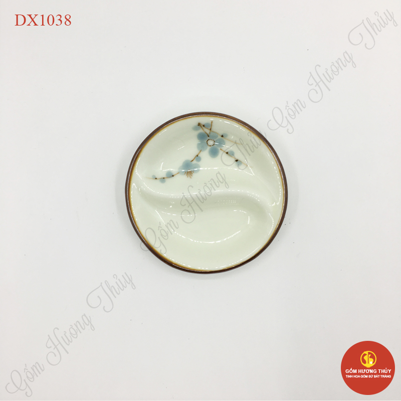 Đĩa muối tròn 2 ngăn men kem vẽ đào xanh
