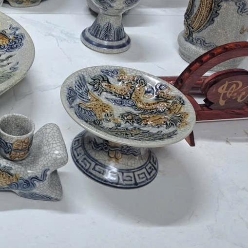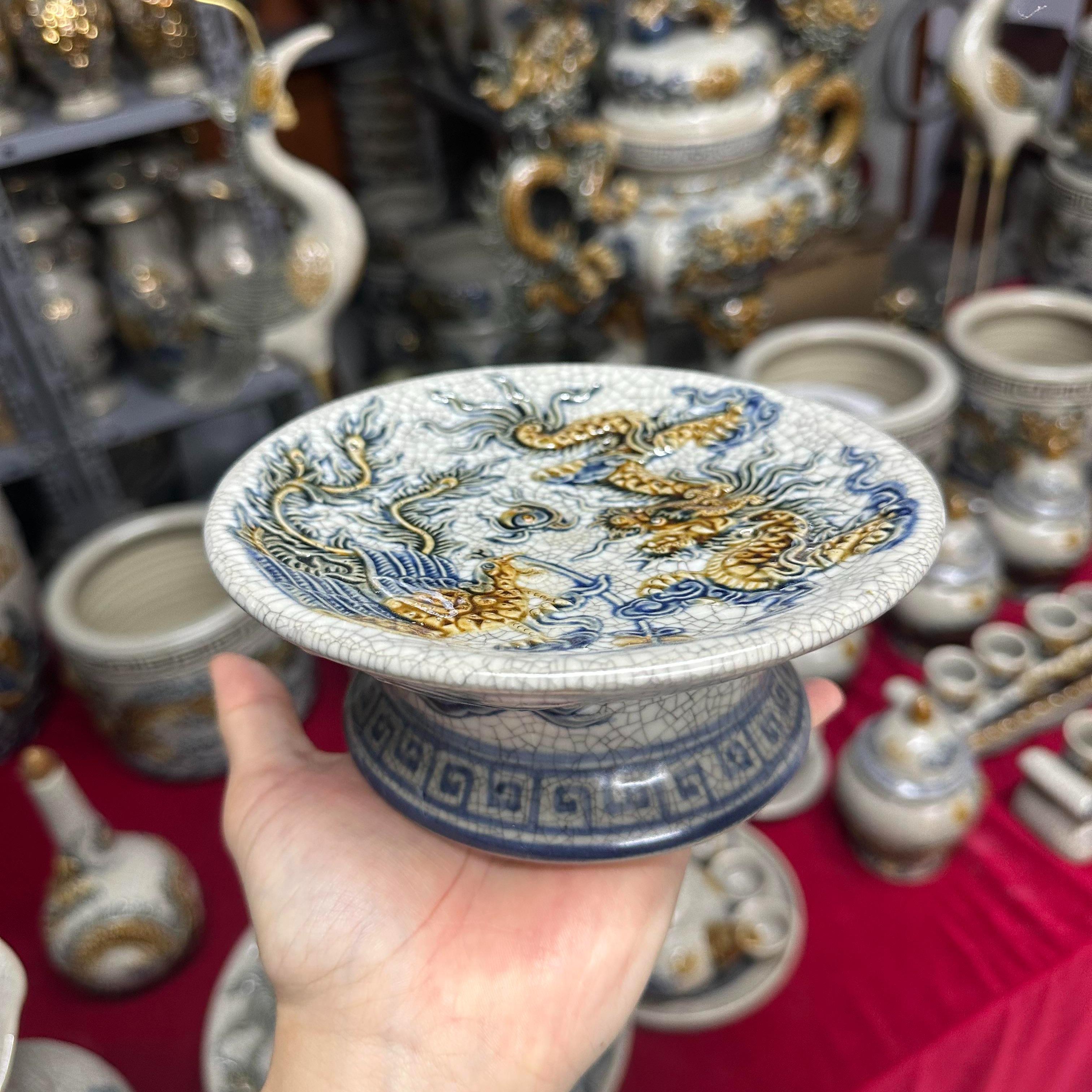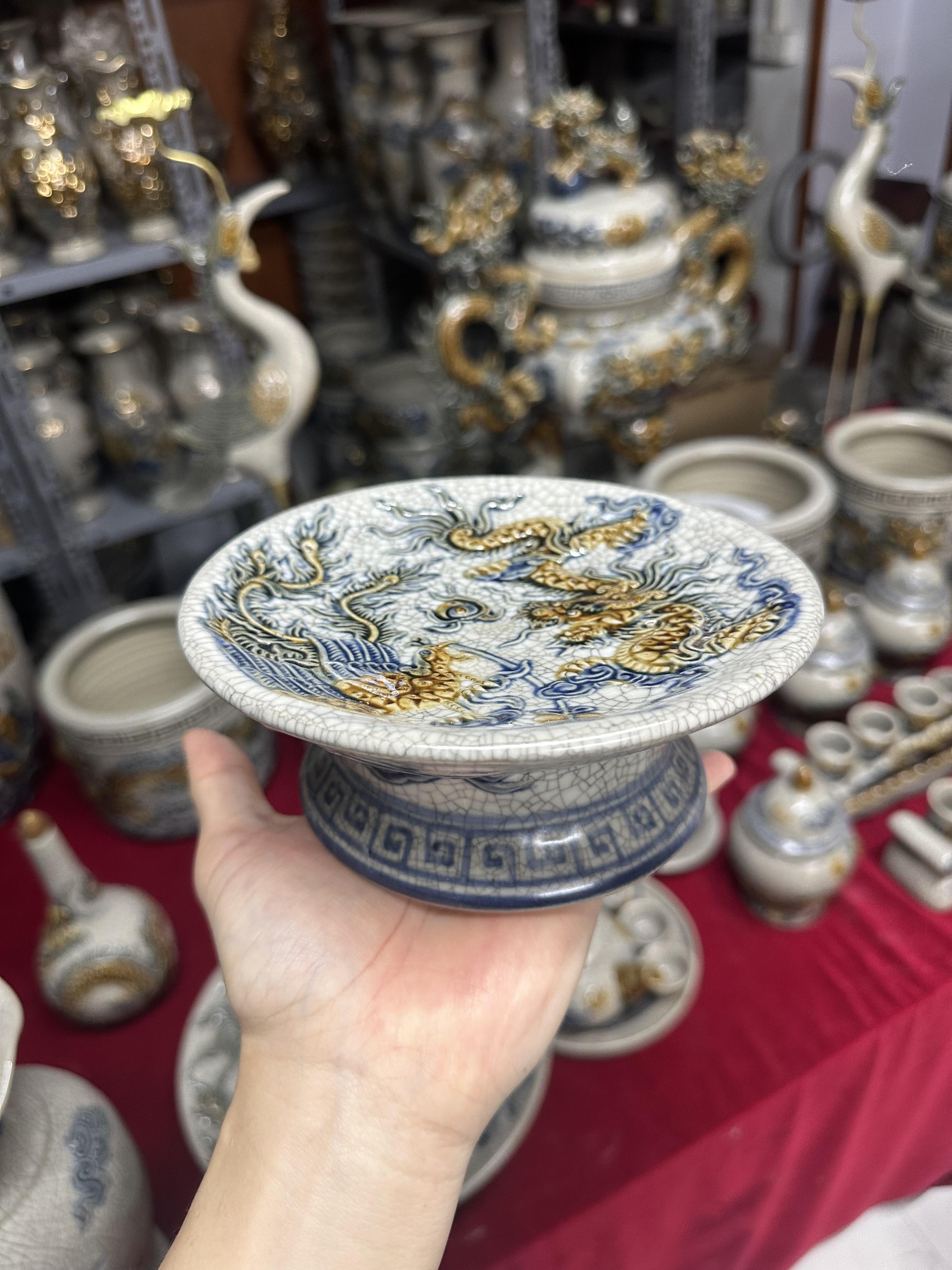 * Các hoa văn họa tiết như hình rồng, phượng, hoa, mây, sóng thủy ba,… được đắp nổi hoặc khắc chìm lên sản phẩm, các hoa văn này sẽ được sử dụng một loại men khác để vẽ lên, có thể là men ngọc, men nâu,… Sự kết hợp giữa các dòng men được người thợ Bát Tràng sử dụng nhuần nhuyễn và cho ra lò những sản phẩm đáp ứng nhu cầu cao của Khách hàng.