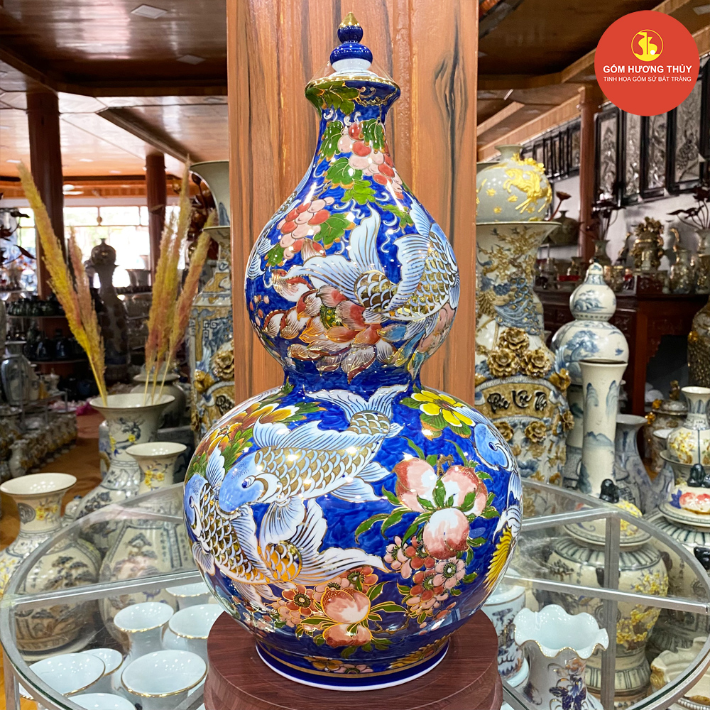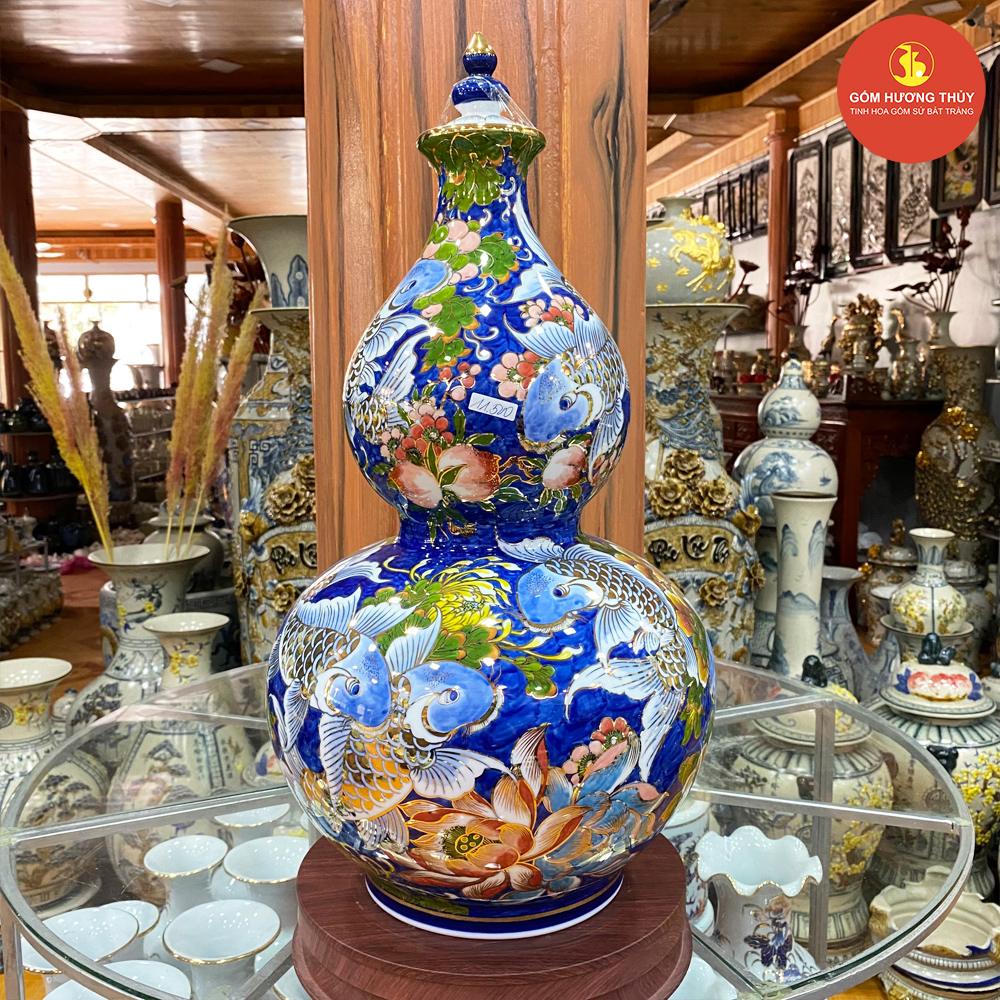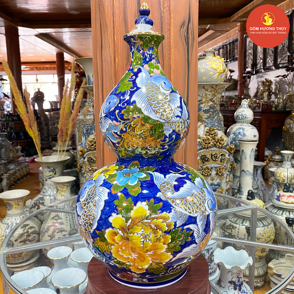 TÊN SẢN PHẨM: Hồ lô H60 Sen cá nền xanh coban Vẽ vàng kim