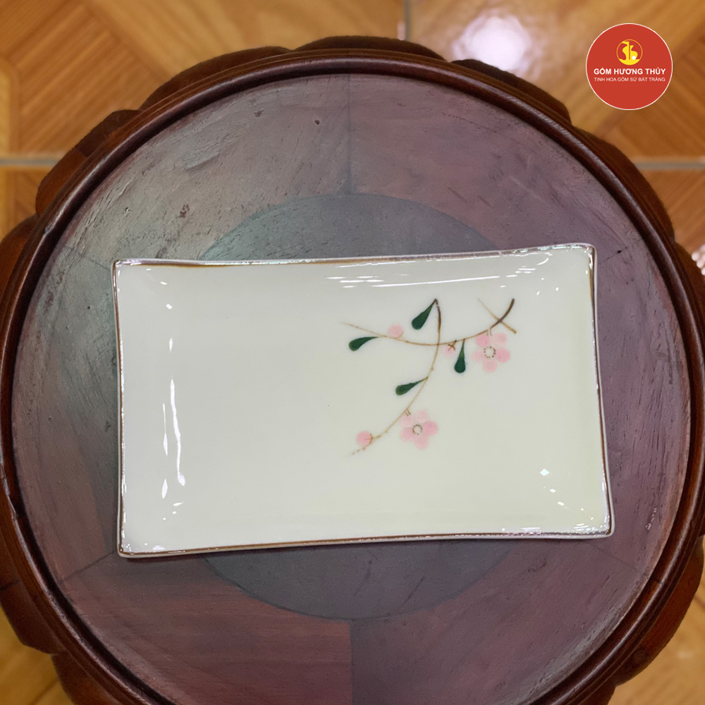 TÊN SẢN PHẨM: Khay chữ nhật men kem vẽ đào hồng