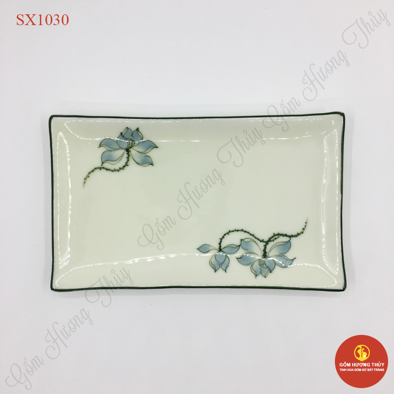 TÊN SẢN PHẨM: Khay Chữ nhật men kem vẽ sen xanh