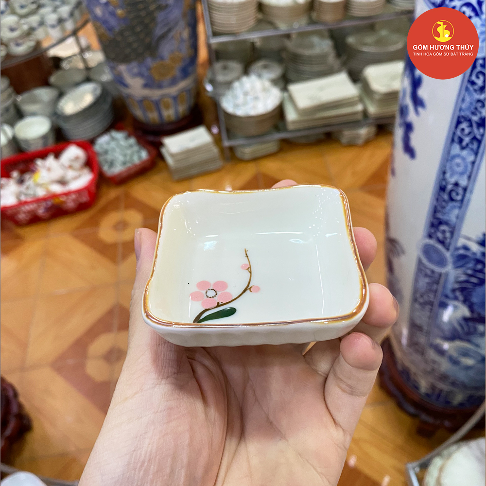 TÊN SẢN PHẨM: Khay gia vị vuông men kem vẽ đào hồng