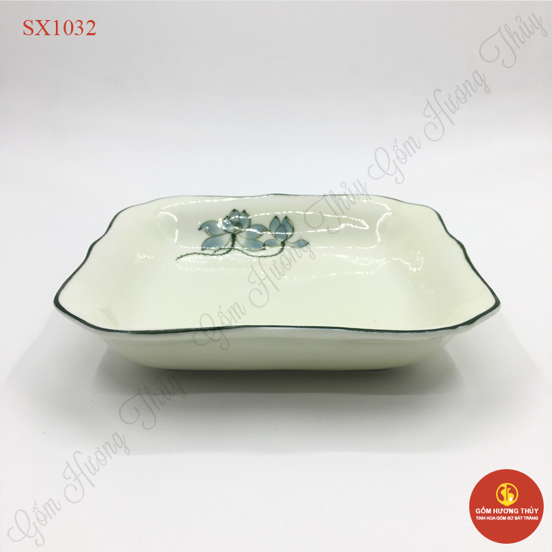 TÊN SẢN PHẨM: Khay vuông cao men kem vẽ sen xanh