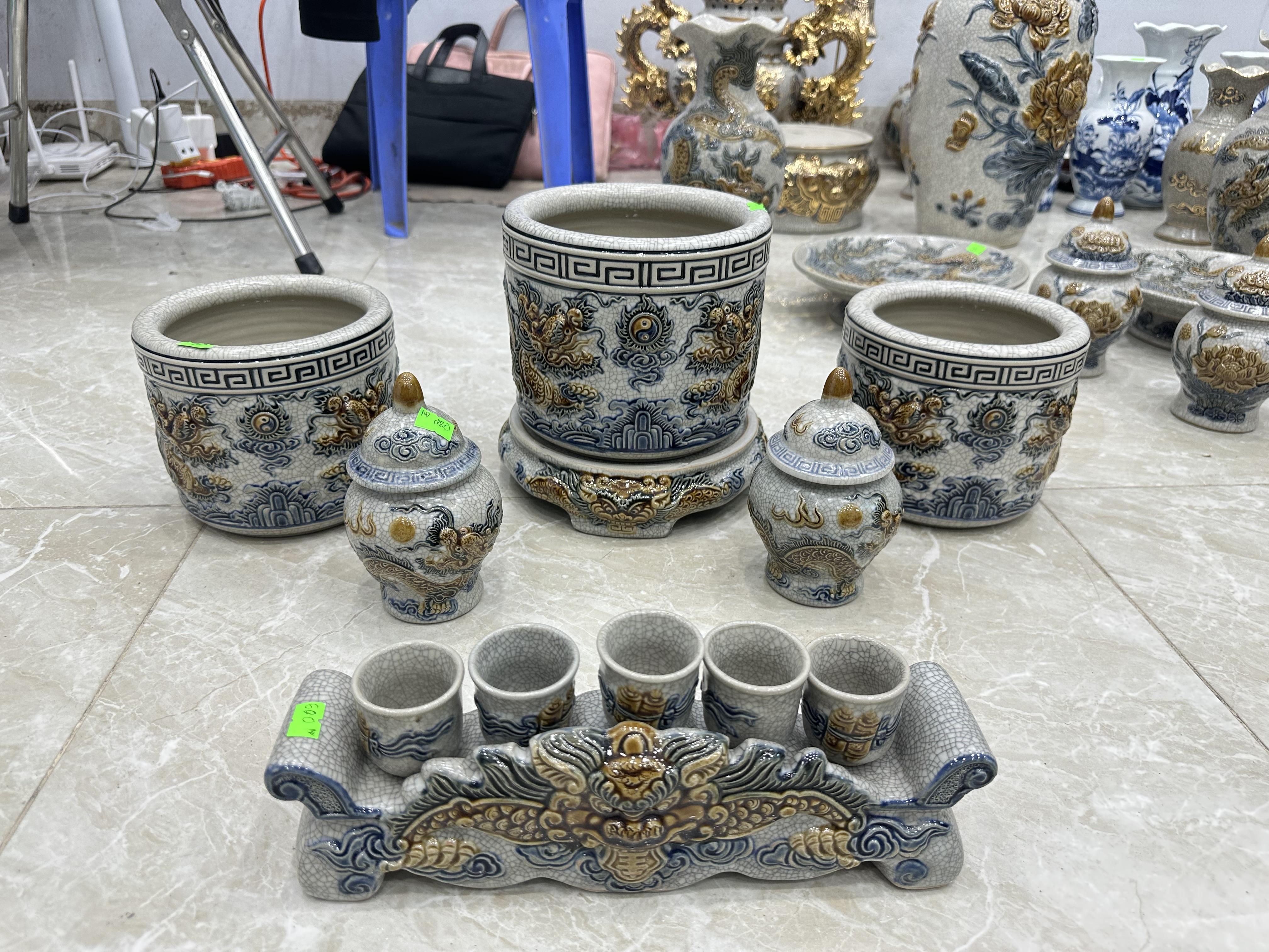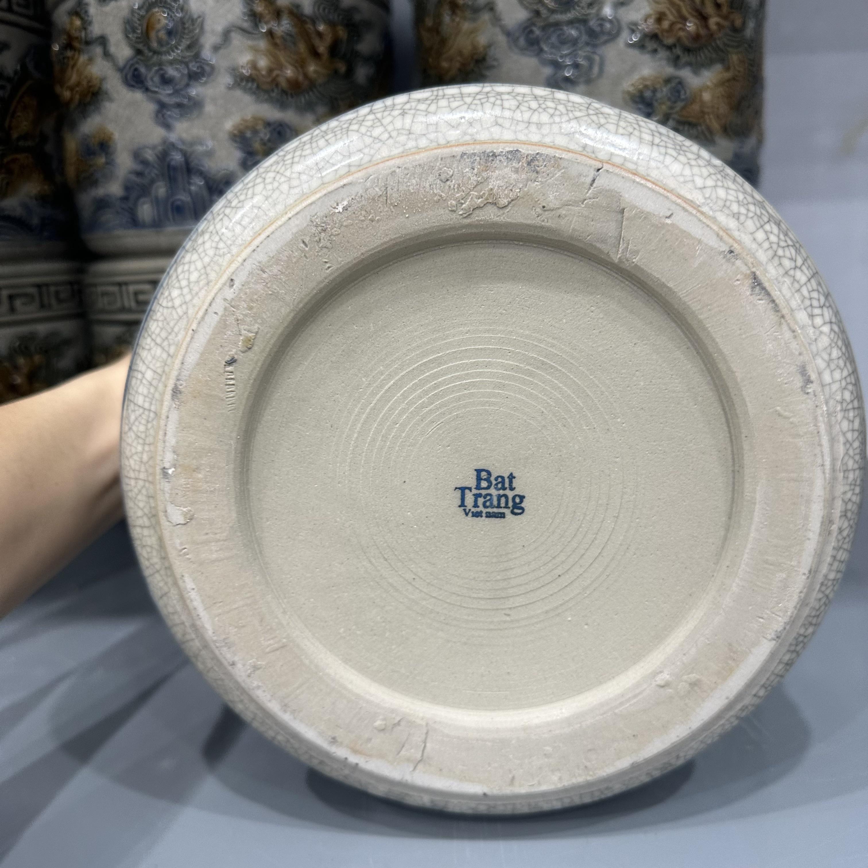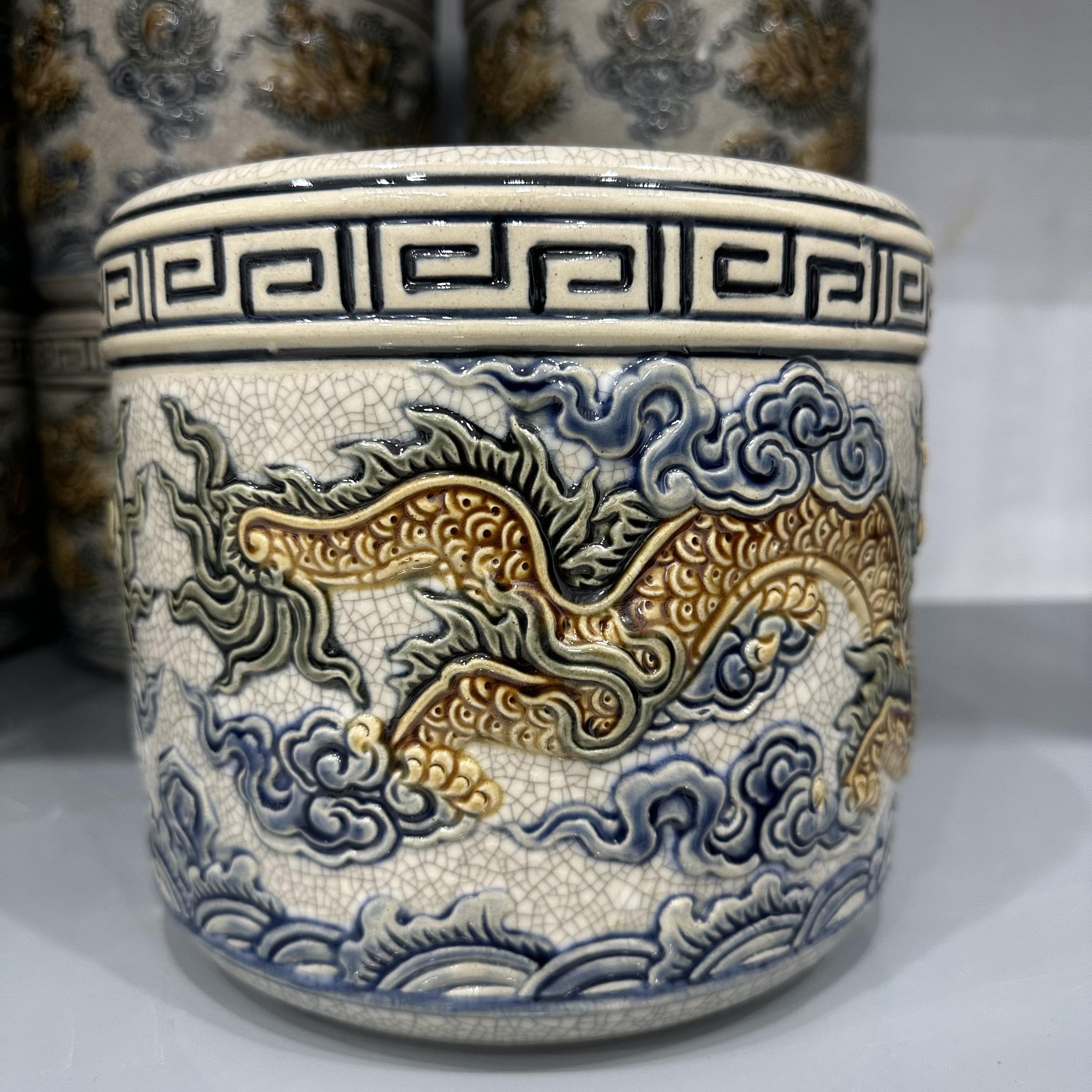 * Các hoa văn họa tiết như hình rồng, phượng, hoa, mây, sóng thủy ba,… được đắp nổi hoặc khắc chìm lên sản phẩm, các hoa văn này sẽ được sử dụng một loại men khác để vẽ lên, có thể là men ngọc, men nâu,… Sự kết hợp giữa các dòng men được người thợ Bát Tràng sử dụng nhuần nhuyễn và cho ra lò những sản phẩm đáp ứng nhu cầu cao của Khách hàng.