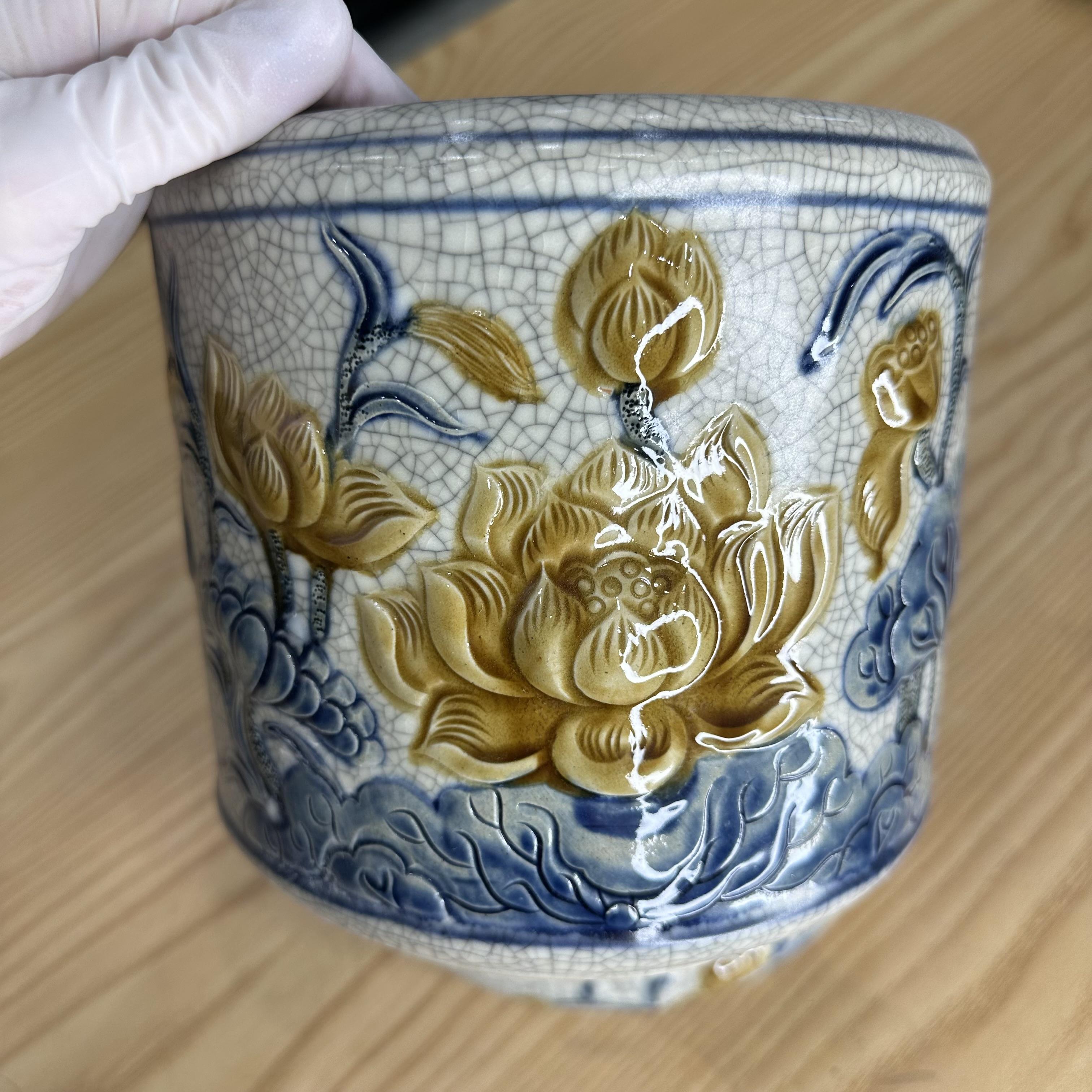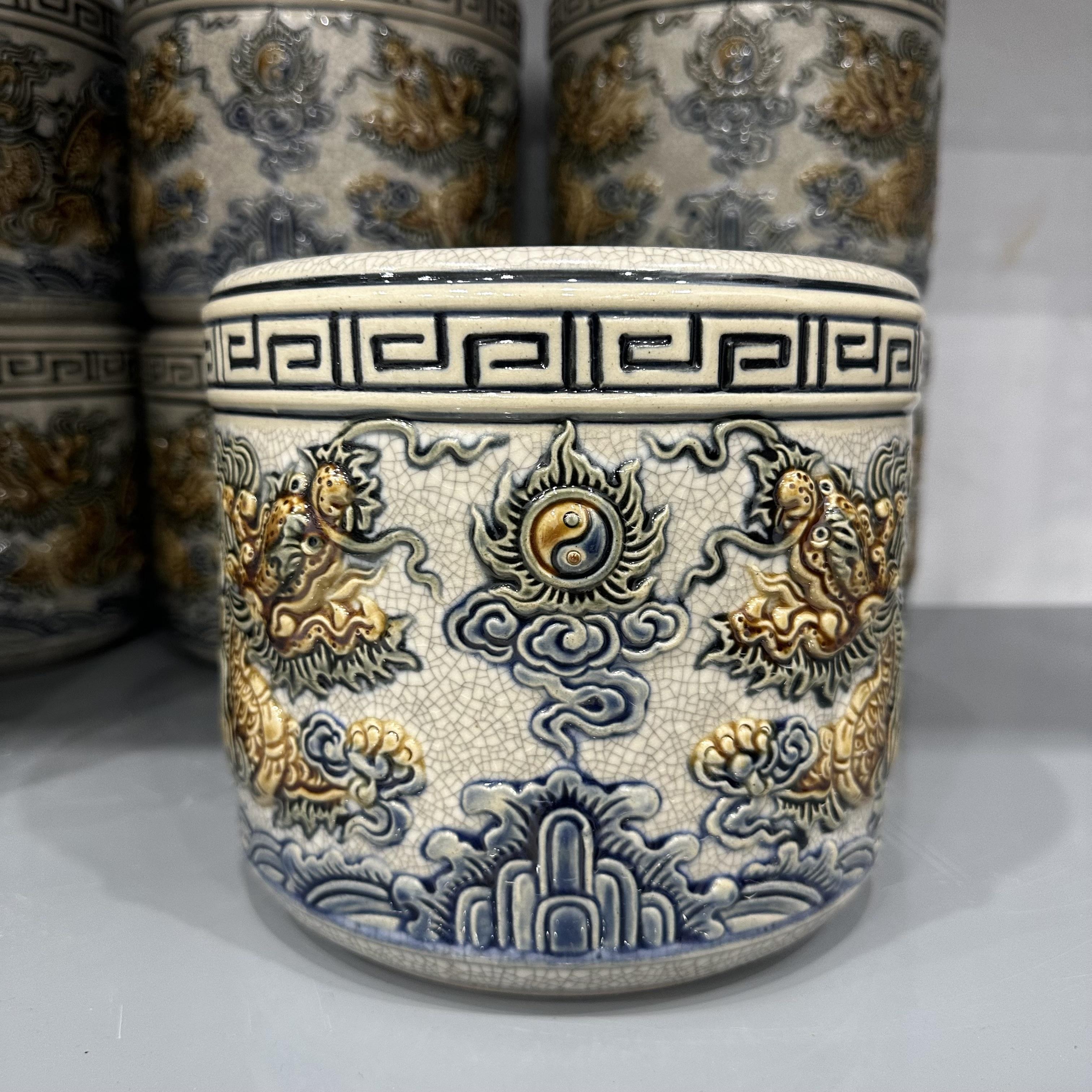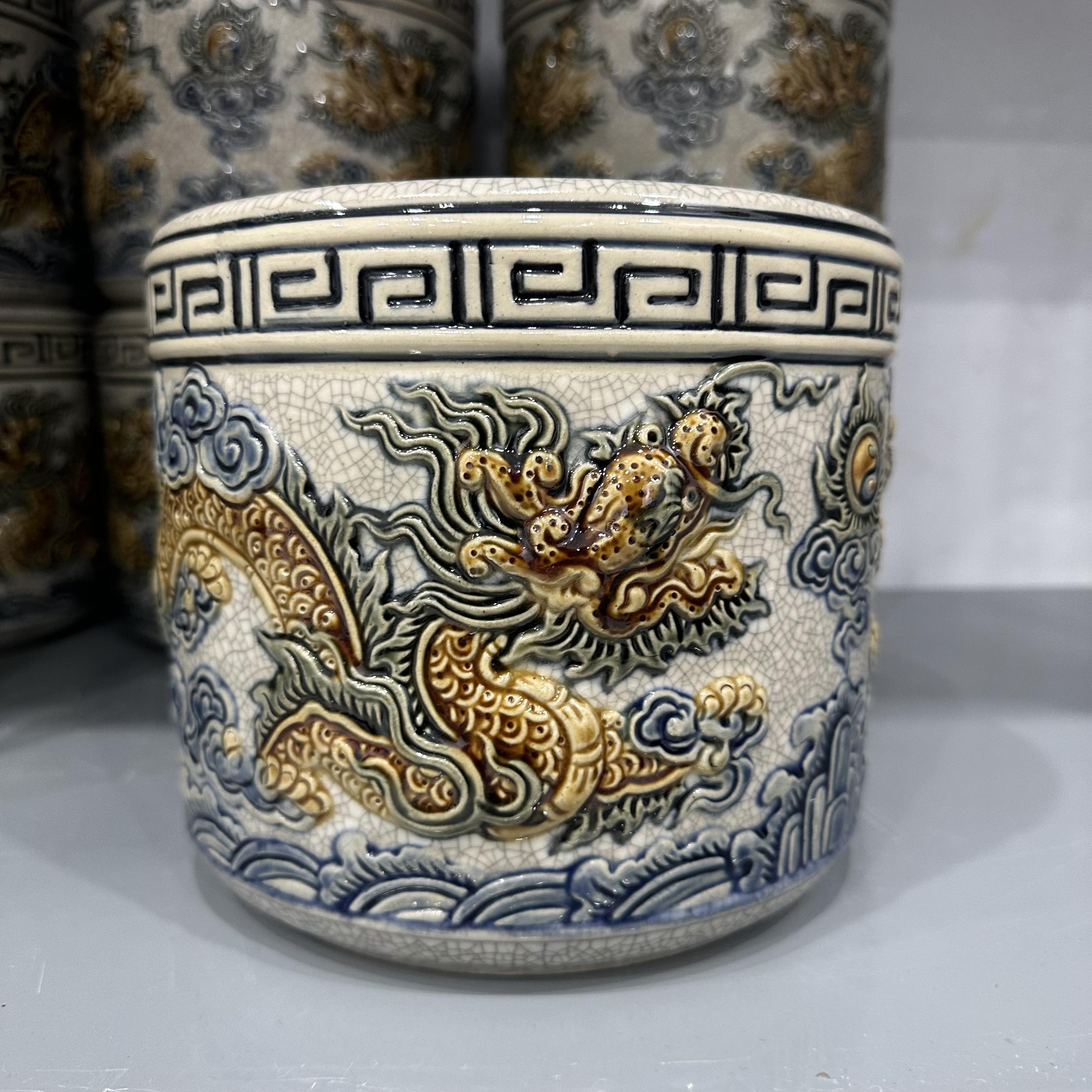 * Các hoa văn họa tiết như hình rồng, phượng, hoa, mây, sóng thủy ba,… được đắp nổi hoặc khắc chìm lên sản phẩm, các hoa văn này sẽ được sử dụng một loại men khác để vẽ lên, có thể là men ngọc, men nâu,… Sự kết hợp giữa các dòng men được người thợ Bát Tràng sử dụng nhuần nhuyễn và cho ra lò những sản phẩm đáp ứng nhu cầu cao của Khách hàng.