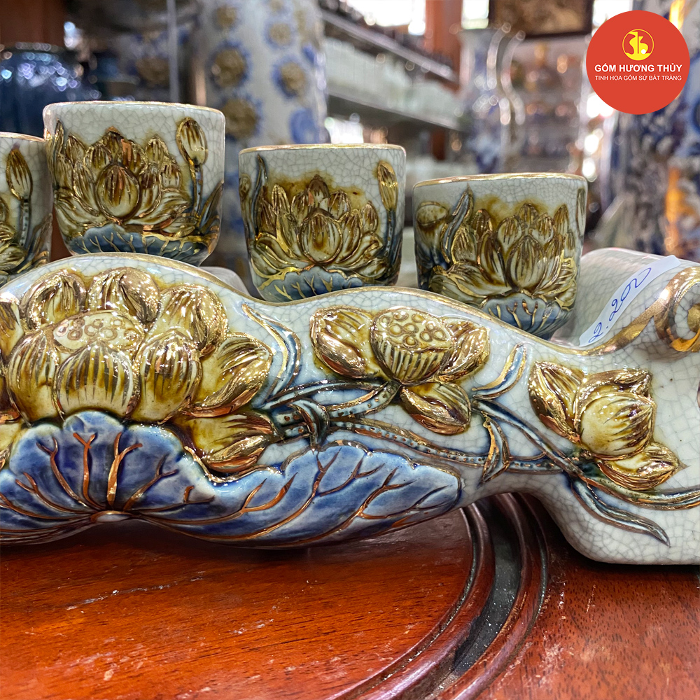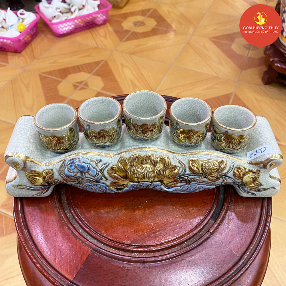 TÊN SẢN PHẨM: Kỷ ngai 5 men rạn đắp nổi Vẽ vàng kim