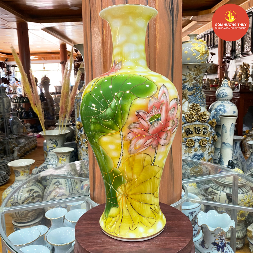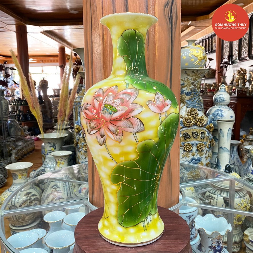 TÊN SẢN PHẨM: Mai bình cổ cao H50 Sen đá nền vàng Vẽ vàng kim