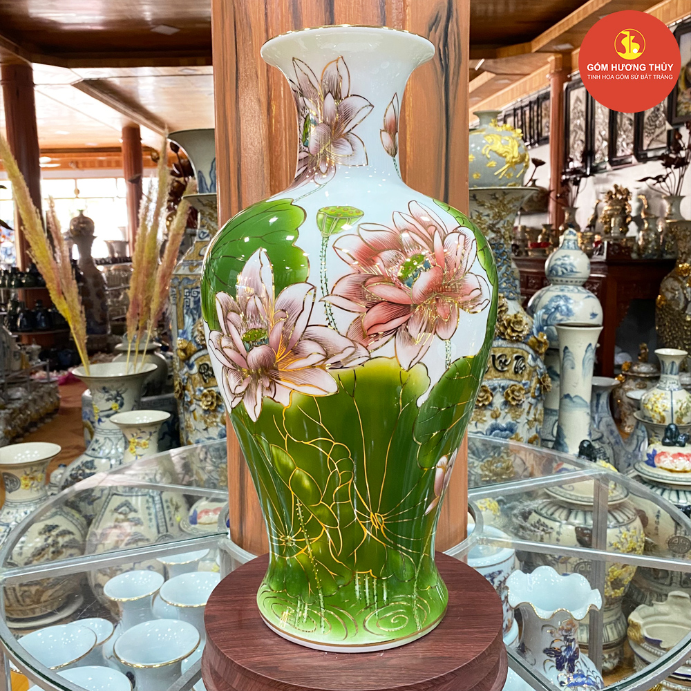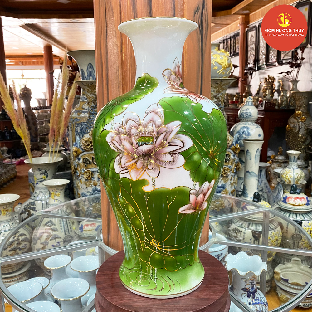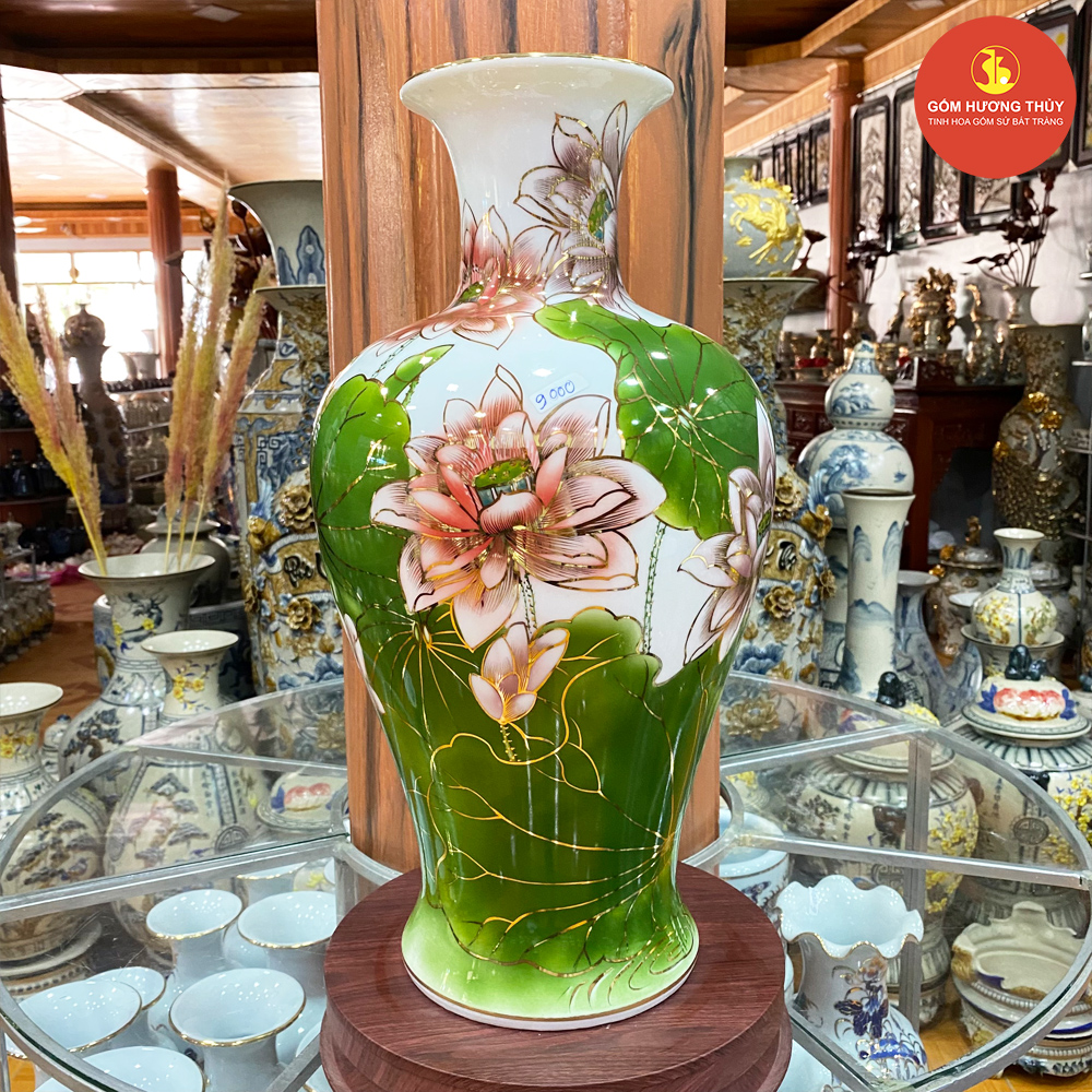 TÊN SẢN PHẨM: Mai bình cổ cao H50 Sen 30 nền trắng Vẽ vàng kim