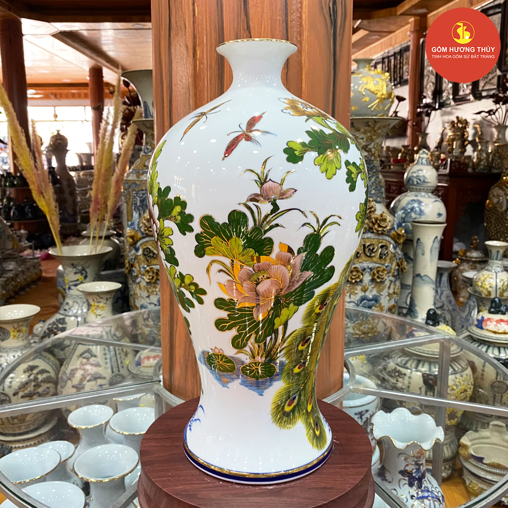 TÊN SẢN PHẨM: Mai bình H50 Chim công nền trắng Vẽ vàng kim