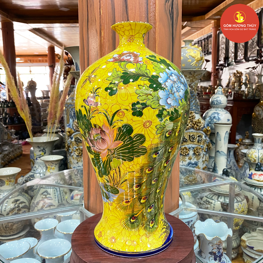 TÊN SẢN PHẨM: Mai bình H50 Chim Công nền vàng Vẽ vàng kim