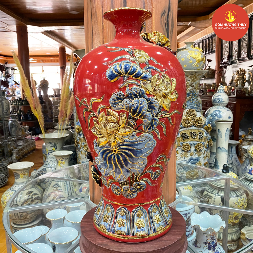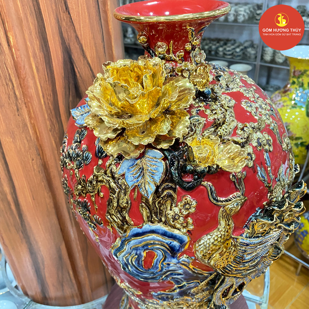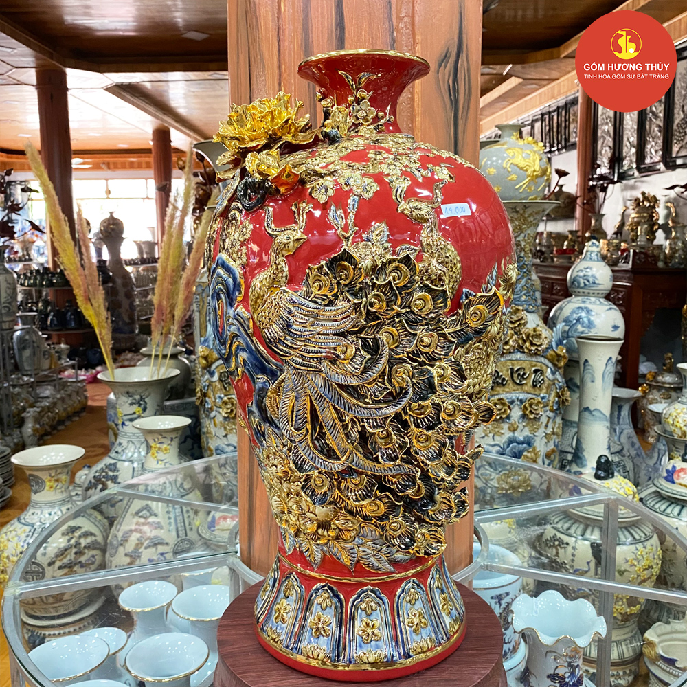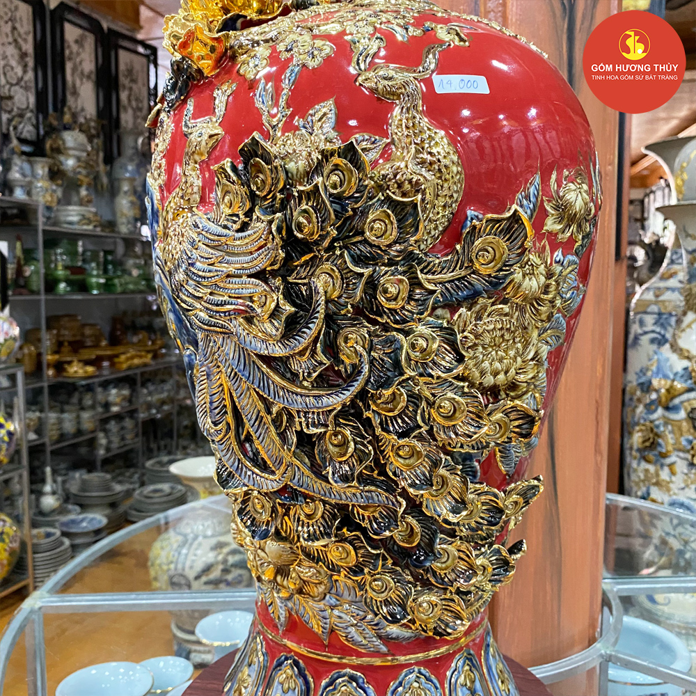 TÊN SẢN PHẨM: Mai bình H55 Chim công đắp nổi nền đỏ vẽ vàng kim