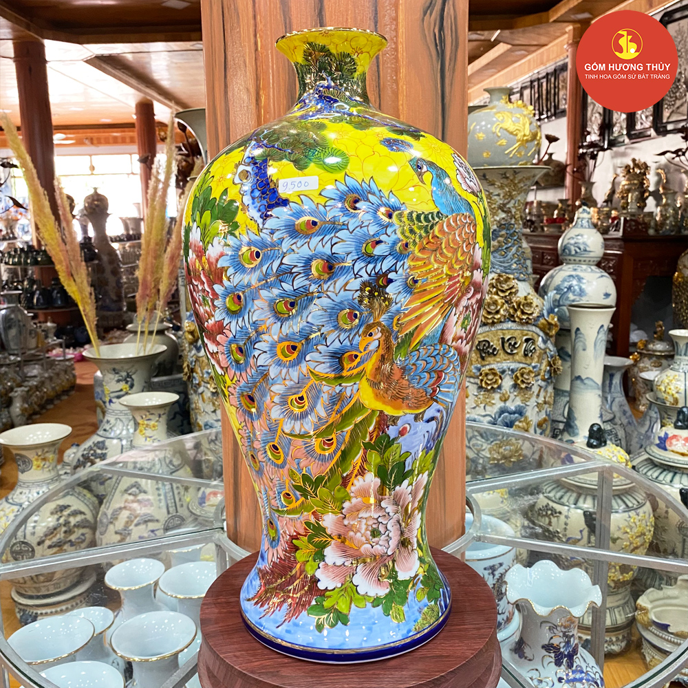TÊN SẢN PHẨM: Mai bình H55 Chim công nền vàng Vẽ vàng kim