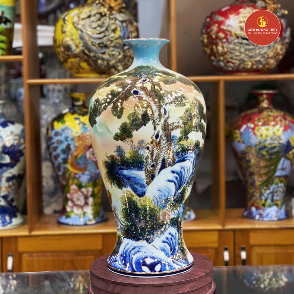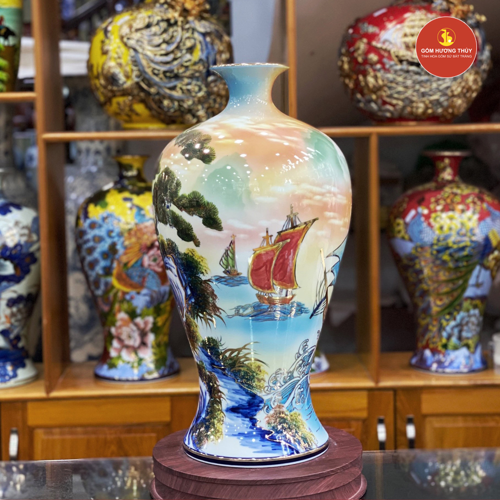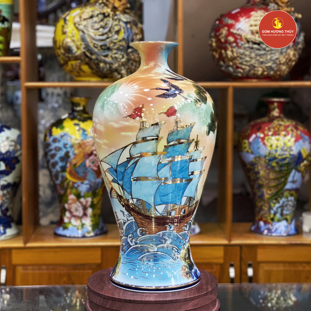 TÊN SẢN PHẨM: Mai Bình H55 Thuyền Buồm nền hoàng hôn 3D Vẽ Vàng 24K
