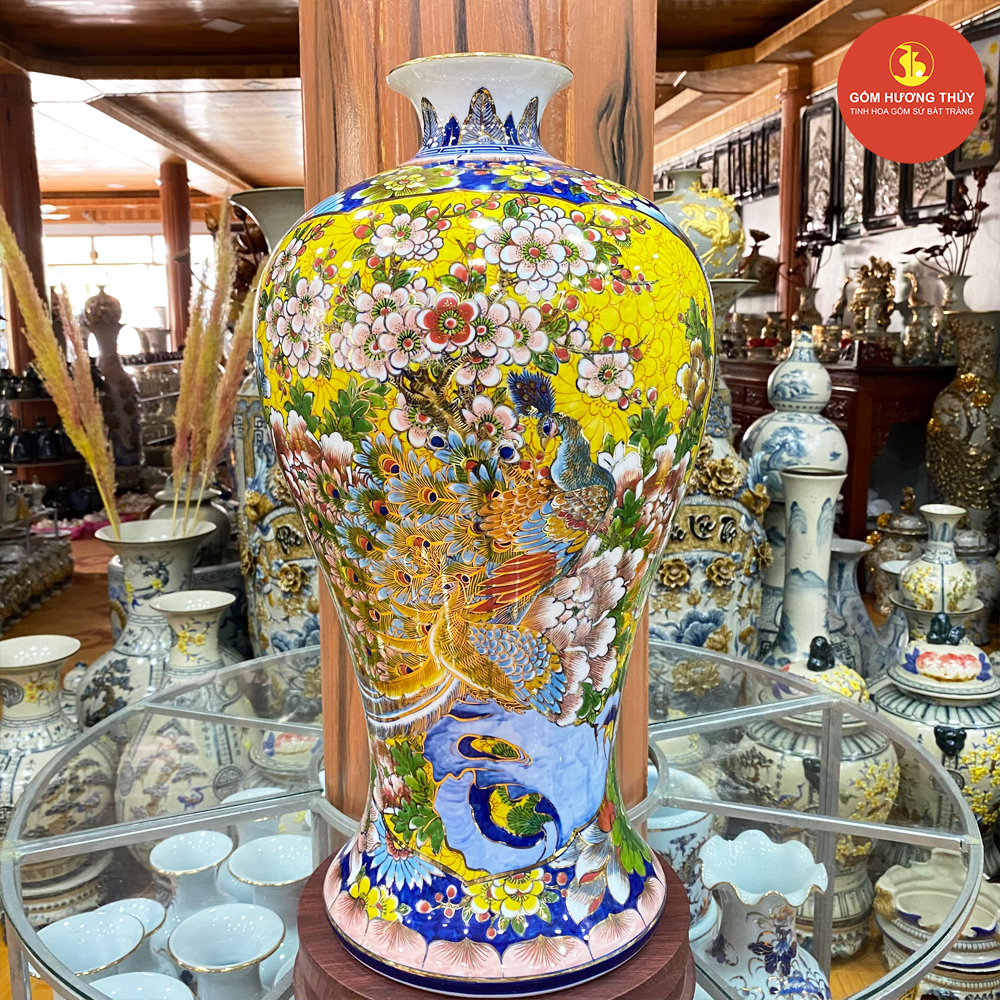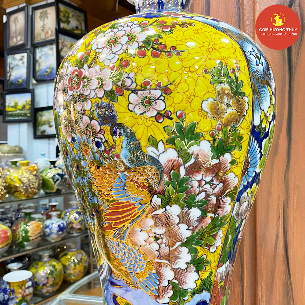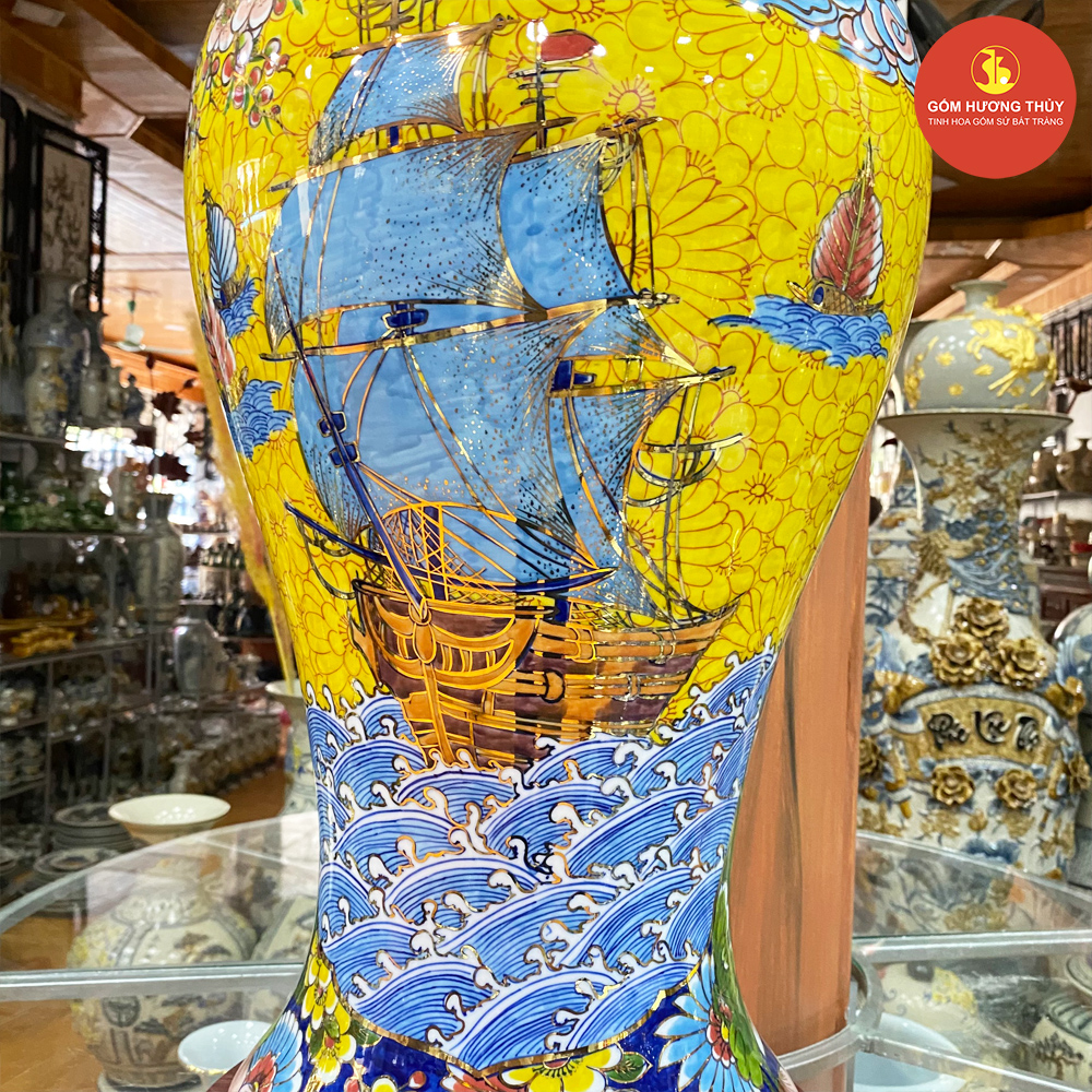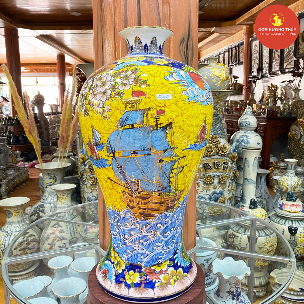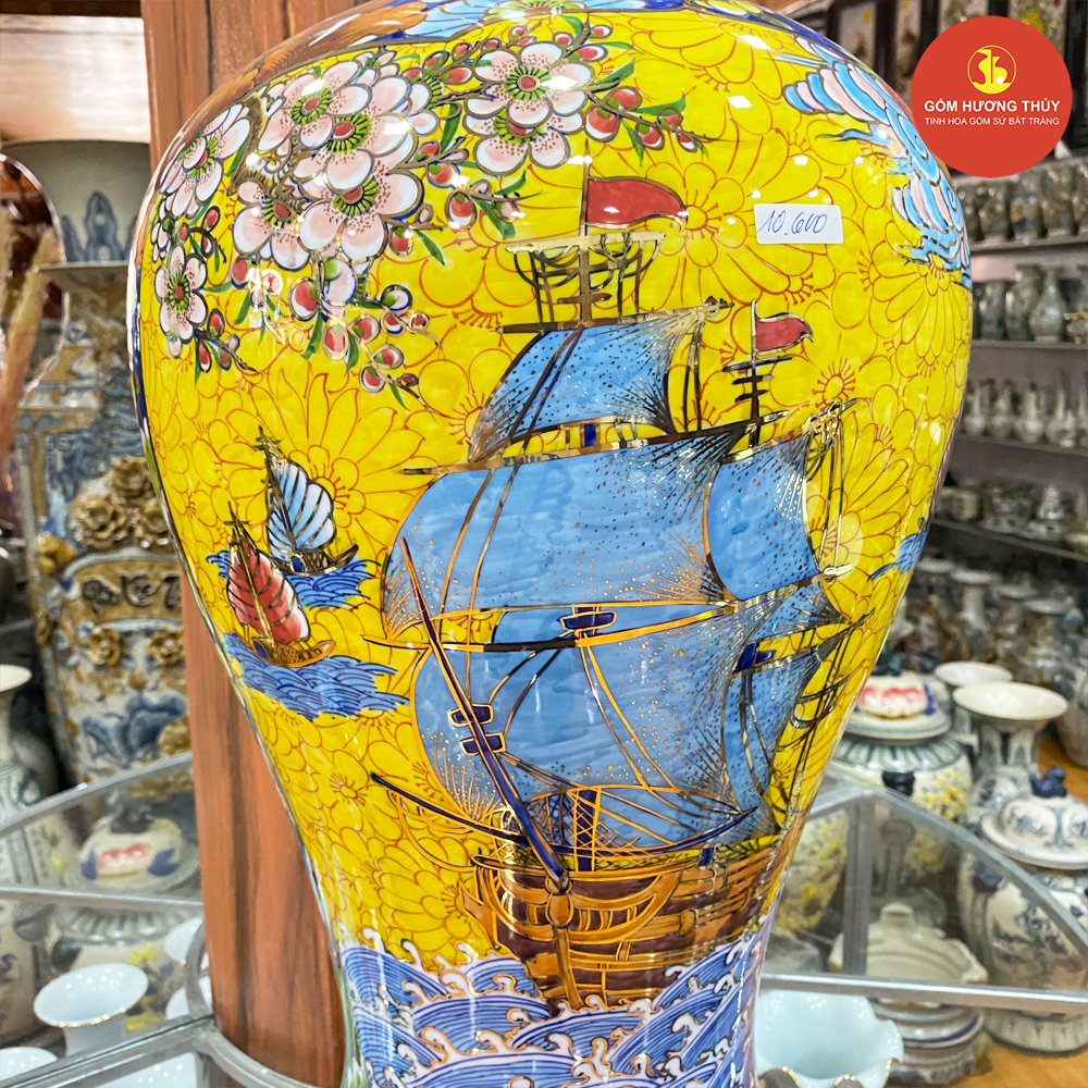 TÊN SẢN PHẨM: Mai bình H60 Nhị cảnh Thuyền-Công nền vàng Vẽ vàng kim